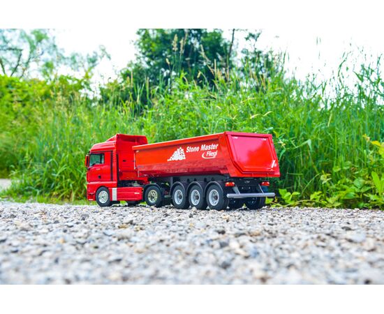 Der Bausatz ist serienmässig mit einem Stahlrahmen und einer Stahlmulde samt Rückwand, einer ABS-Arbeitsbühne, halbrunden ABS-Kotflügeln, Königsbolzen, höhenverstellbaren Aufliegerstützen, originalgetreuen Luftfeder-Attrappen und einem Kugellagersatz ausgestattet. Die 7-Kammerrückleuchten des CARSON 3-Achs Muldenkippers Fliegl Stone Master sind elektrisch nachrüstbar.