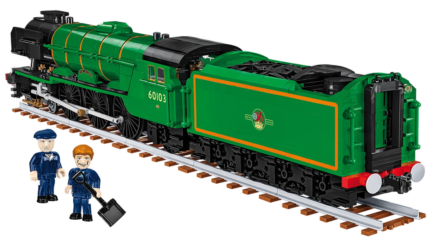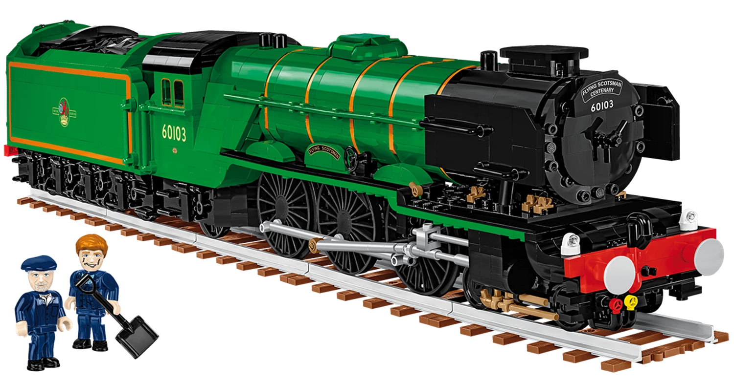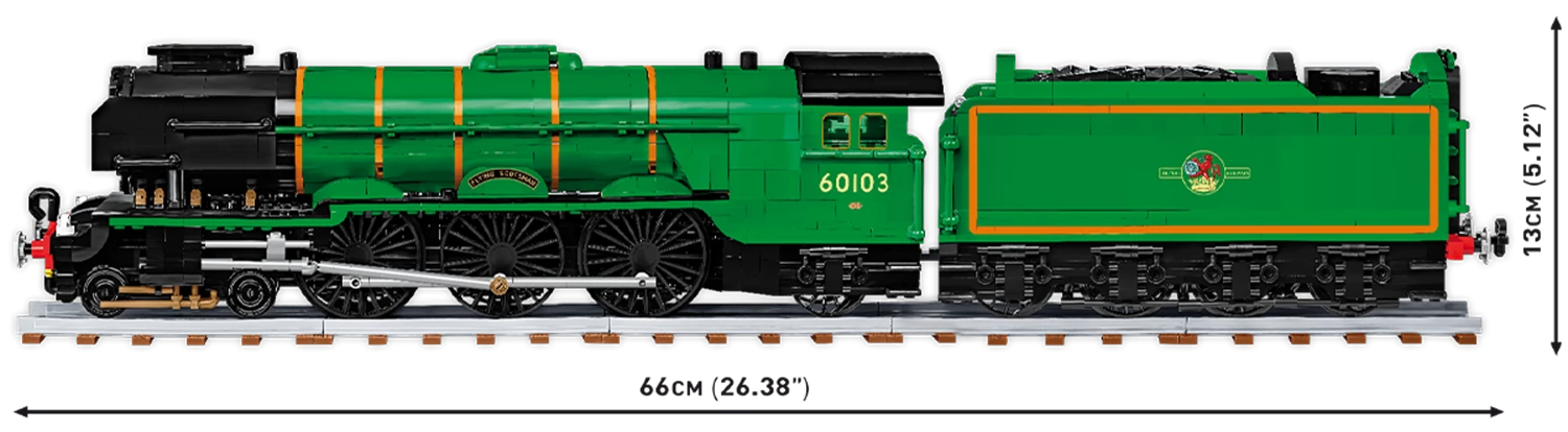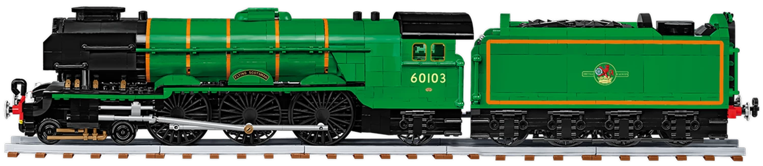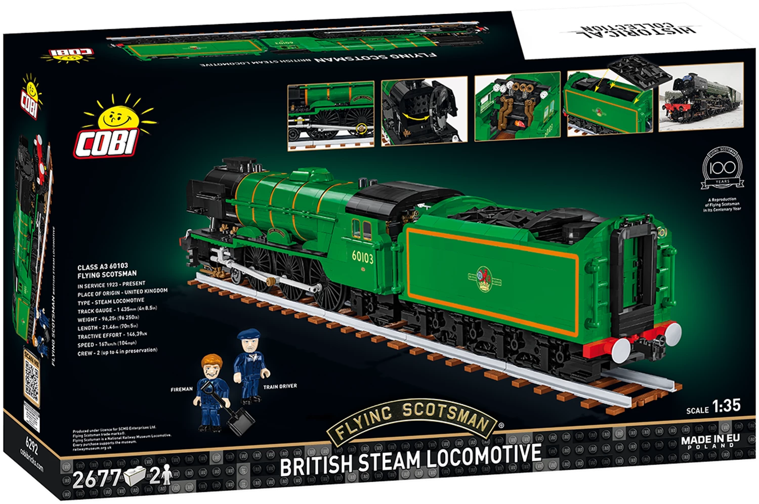 Der Flying Scotsman ist sowohl der Name einer berühmten Dampflokomotive als auch der eines Linienzuges, der die englische Hauptstadt London mit ihrem schottischen Pendant Edinburgh verbindet. Der Zug verkehrte von 1862 - 2011 auf der Hauptstrecke der East Coast Main Line (ECML) in beiden Richtungen zwischen dem Londoner Kings Cross-Bahnhof und der Waverley Station, dem Hauptbahnhof von Edinburgh. Er berührte dabei die Städte Peterborough, Doncaster, York, Darlington, Newcastle, Berwick-upon-Tweed und Dunbar. Die Reisezeit konnte im Laufe der Zeit von zehneinhalb Stunden auf exakt 4 Stunden (mit einem Halt in Newcastle) gesenkt werden. Seit 2011 fährt der Zug nur noch von Edinburgh nach London. Er gilt als schnellste Verbindung zwischen den beiden Städten und wird mit Hochgeschwindigkeitszügen der japanischen Firma Hitachi betrieben. Das Cobi-Modell zeigt die Lokomotive 4472 'Flying Scotsman' aus dem Jahr 1923, eine Schlepptenderlokomotive der LNER-Klasse A3, die als einziges Exemplar ihrer Klasse erhalten geblieben ist und seit 2016 für Sonderzüge eingesetzt wird. Modell mit 2677 Teilen, 2 Minifiguren, bedruckten Blöcken und beweglichen Elementen. Modellmasse (LxBxH): 66 x 10 x 13 cm