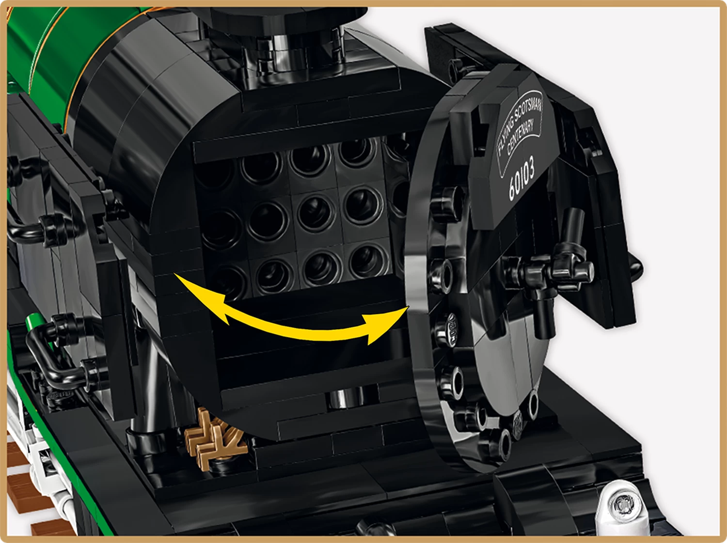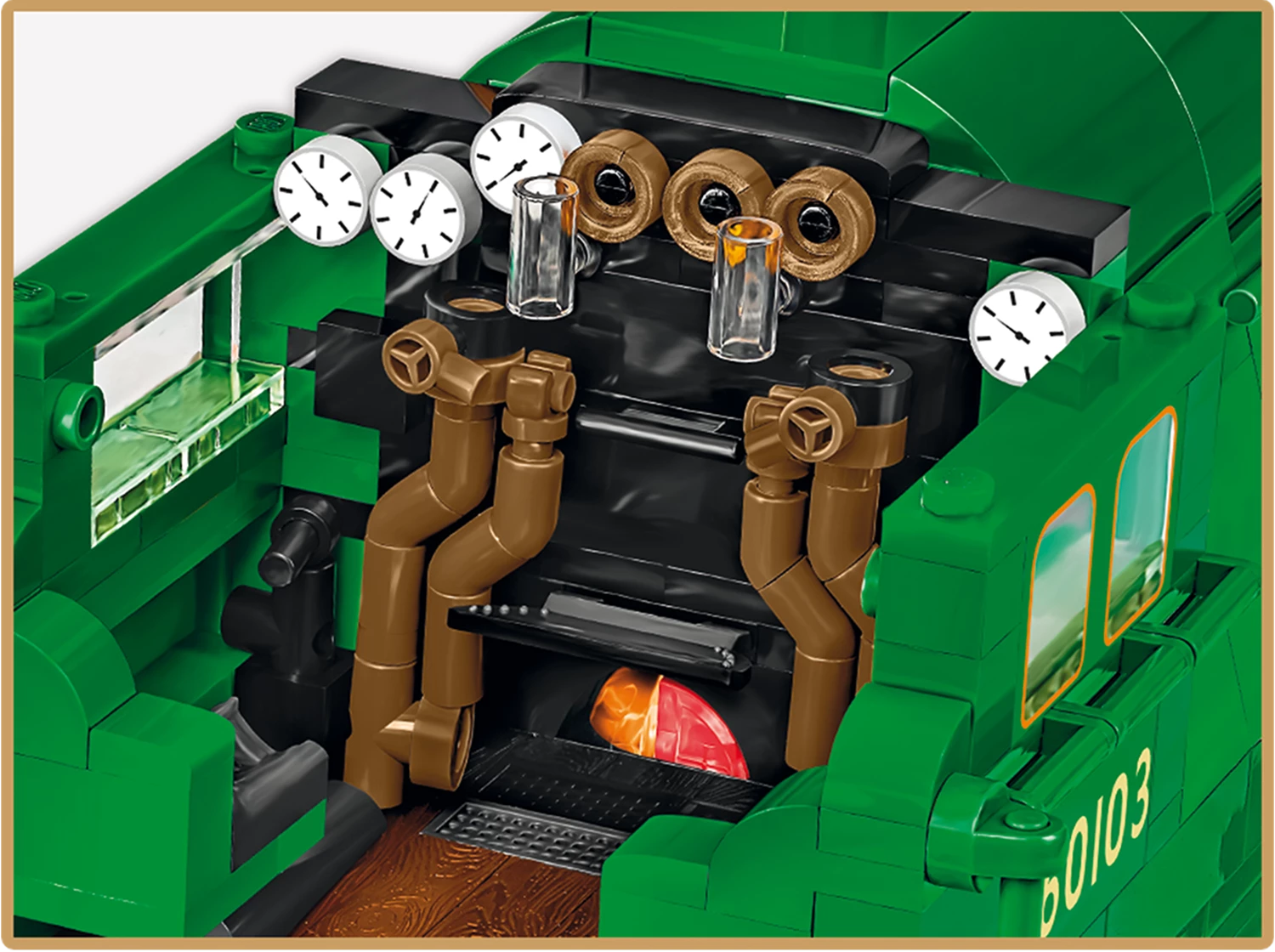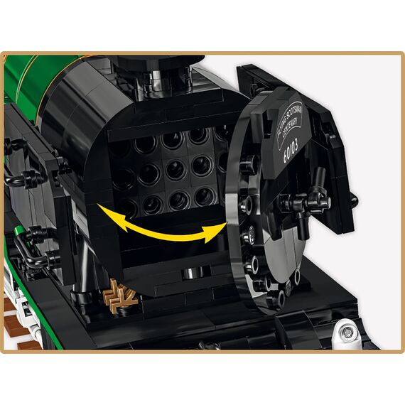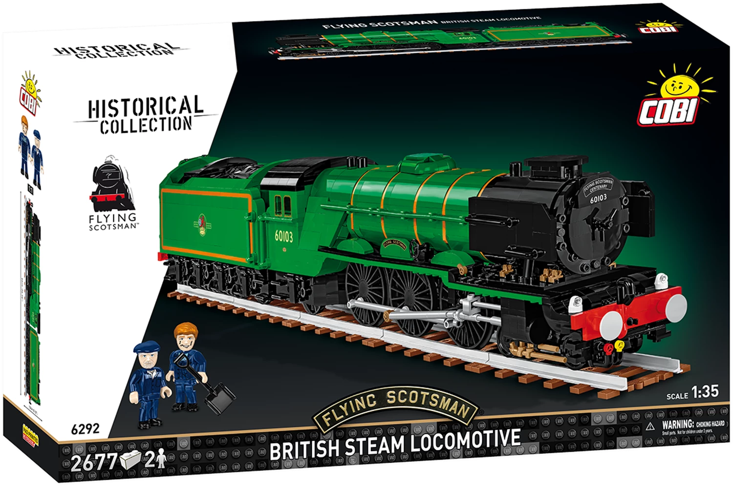 Der Flying Scotsman ist sowohl der Name einer berühmten Dampflokomotive als auch der eines Linienzuges, der die englische Hauptstadt London mit ihrem schottischen Pendant Edinburgh verbindet. Der Zug verkehrte von 1862 - 2011 auf der Hauptstrecke der East Coast Main Line (ECML) in beiden Richtungen zwischen dem Londoner Kings Cross-Bahnhof und der Waverley Station, dem Hauptbahnhof von Edinburgh. Er berührte dabei die Städte Peterborough, Doncaster, York, Darlington, Newcastle, Berwick-upon-Tweed und Dunbar. Die Reisezeit konnte im Laufe der Zeit von zehneinhalb Stunden auf exakt 4 Stunden (mit einem Halt in Newcastle) gesenkt werden. Seit 2011 fährt der Zug nur noch von Edinburgh nach London. Er gilt als schnellste Verbindung zwischen den beiden Städten und wird mit Hochgeschwindigkeitszügen der japanischen Firma Hitachi betrieben. Das Cobi-Modell zeigt die Lokomotive 4472 'Flying Scotsman' aus dem Jahr 1923, eine Schlepptenderlokomotive der LNER-Klasse A3, die als einziges Exemplar ihrer Klasse erhalten geblieben ist und seit 2016 für Sonderzüge eingesetzt wird. Modell mit 2677 Teilen, 2 Minifiguren, bedruckten Blöcken und beweglichen Elementen. Modellmasse (LxBxH): 66 x 10 x 13 cm