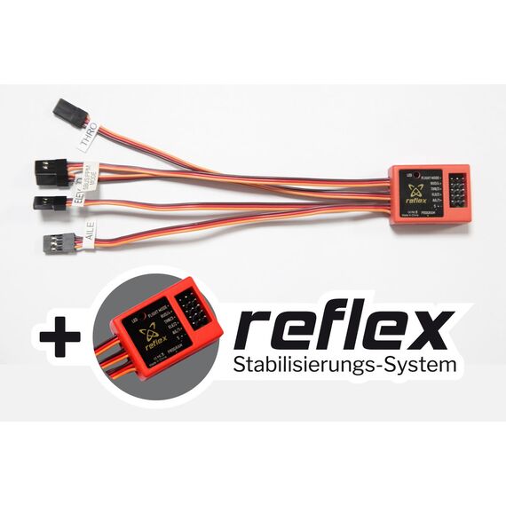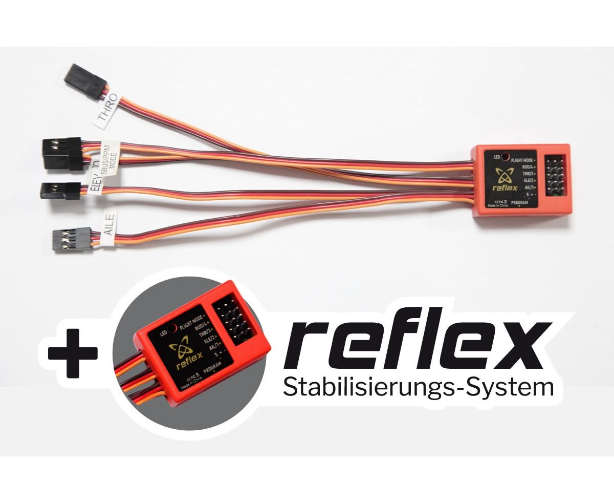 Reflex Stabilisierungssystem (in diesem Set enthalten) Diesem Set liegt ein speziell für dieses Flugzeug programmiertes Reflex System bei. Dieses elektronische Stabilisierungssystem wurde entwickelt, um den Piloten bei Steuerbefehlen zu unterstützen, jedoch nicht zu stören. Das Reflex-System arbeitet sowohl mit PPM- als auch mit SBUS-Eingängen und arbeitet nativ mit allen gängigen Fersteuerungssystemen. Wird das Reflex-System an einem 3-Kanal Schalter belegt kann zwischen 3 verschiedenen Modi gewählt werden: • Stabilized Modus: Beim Loslassen der Steuerknüppel wird das Modell automatisch in eine neutrale Flugstellung gebracht, was gerade Einsteigern und ungeübten Piloten eine Menge Sicherheit in brenzligen Situationen bietet. • Optimized Modus: Das Kreiselsystem des Reflex-Systems wirkt äußerlichen Einflüssen wie Windböen oder Seitenwind entgegen und hält das Modell präzise in stabiler Lage. • Aus: Das Reflex System lässt sich vollständig ausschalten. Das Reflex System ist speziell für dieses Flugmodell eingestellt. Es sind keine weiteren Programmierungen erforderlich, lediglich der Einbau und Anschluss im Modell ist noch durchzuführen. Das Reflex System lässt sich mit allen Empfängern mit mindestens 4 Kanälen verbinden.