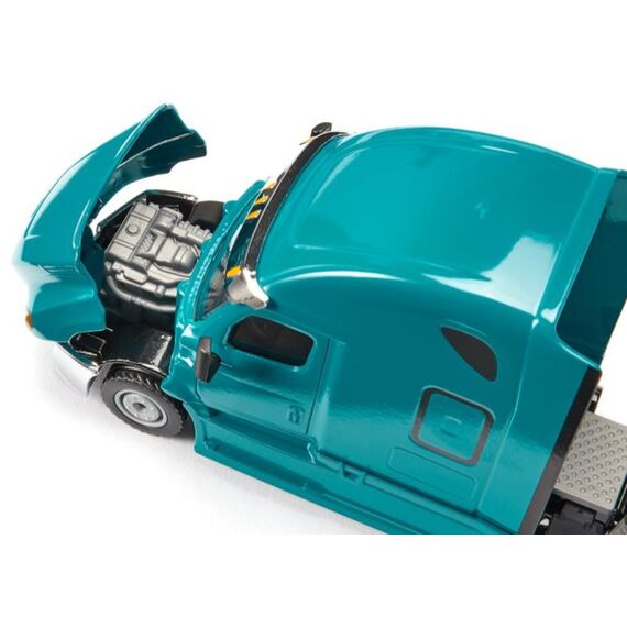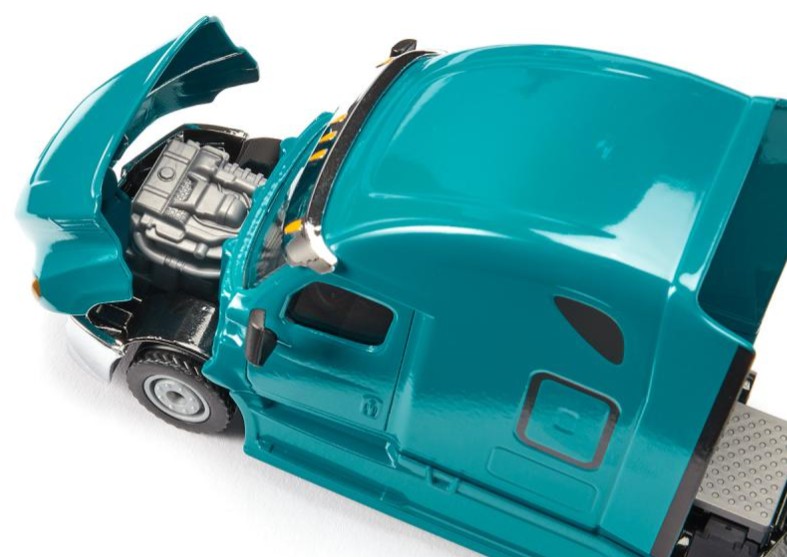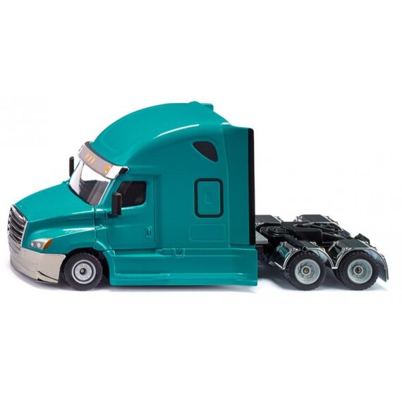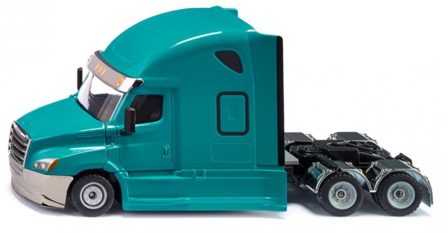 Denn ein Freightliner ist ein überaus robustes und zuverlässiges Fahrzeug, das Tag für Tag auch unter härtesten Bedingungen zum Einsatz kommen kann. Das neue Modell Cascadia, ein wuchtiger US-Truck mit Drei-Achs-Fahrgestell, ist ein Flaggschiff im Fernverkehrssegment und eine beeindruckende Kombination aus modernster Technik, Effizienz und Sicherheit. Und auch an den Fahrer wurde gedacht: Hinter der Fahrerkabine befindet sich ein riesiger Sleeper als komfortable Ruheinsel für unterwegs. Durch die Lackierung in "Miami Blue" mit Chromelementen kommt das auffällige Design des Trucks besonders gut zur Geltung. Die Motorhaube lässt sich öffnen. Bei dem siku-Modell handelt es sich um eine Solozug-Maschine, die durch ihre integrierte Standardkupplung mit sämtlichen Aufliegern der siku-Super-Serie kombiniert werden kann.