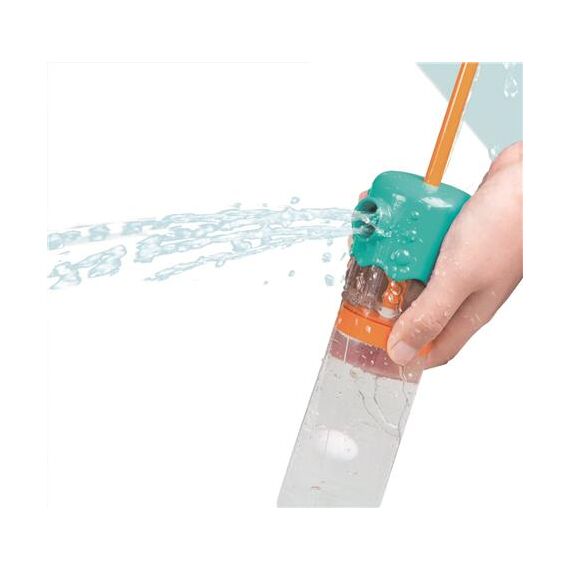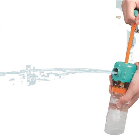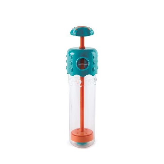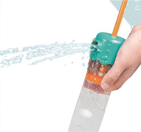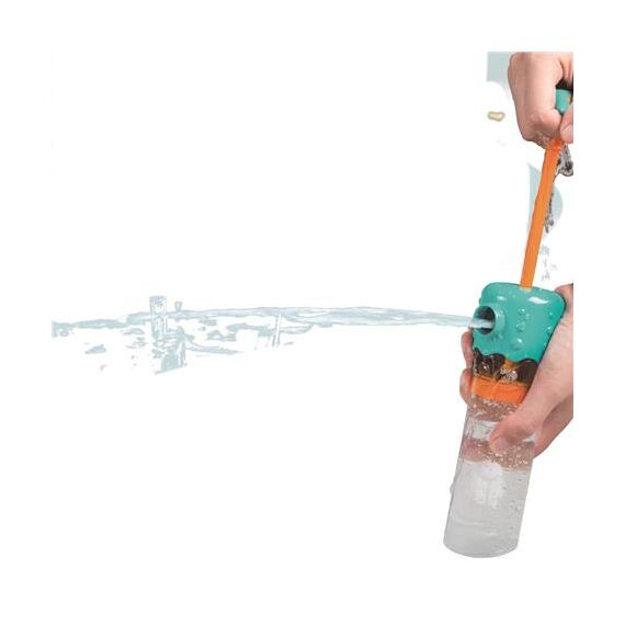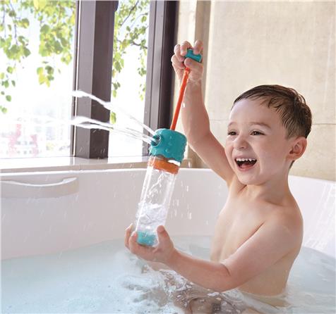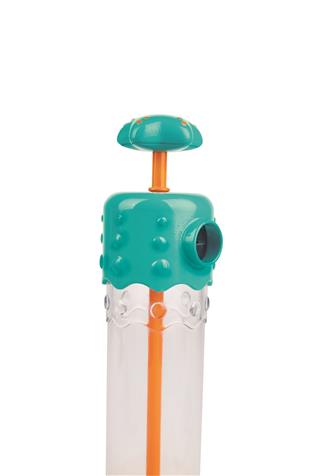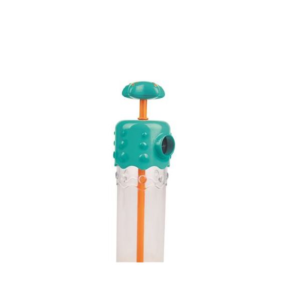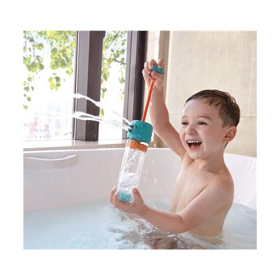 Benutze diese lustige Plastikpumpe und spritze in der Badewanne! Sie hat vier eingebaute Düsen, aus denen das Wasser in einer Reihe fantastischer Formen und Muster herausspritzt.