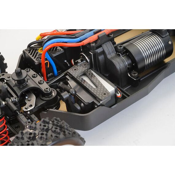 Unter der Haube bietet die MK2RS Rallye-Plattform eine robuste und anpassbare Plattform mit zahlreichen High-End-Komponenten, die dafür sorgen, dass Sie unbeschadet ins Parc Fermé gelangen. Neben einem 2,5 mm starken Aluminium-Chassis gehören CNC-gefräste Legierungsteile wie Aufhängungshalterungen, verschiebbare Motorhalterung, Öldruckstoßdämpfer, Servohalterung und Lenkplatte zur Serienausstattung. Carbonfaser-Stoßdämpferbrücken vorne und hinten sowie eine Servohalterung sind normalerweise der Optionsliste vorbehalten.