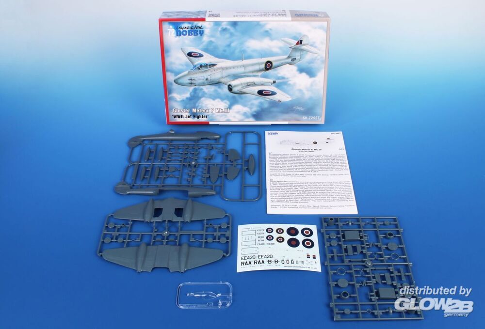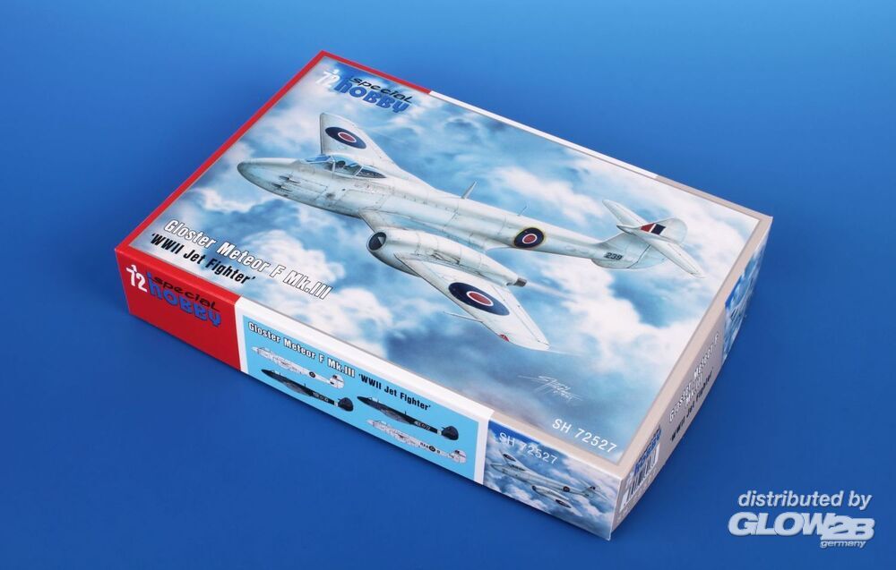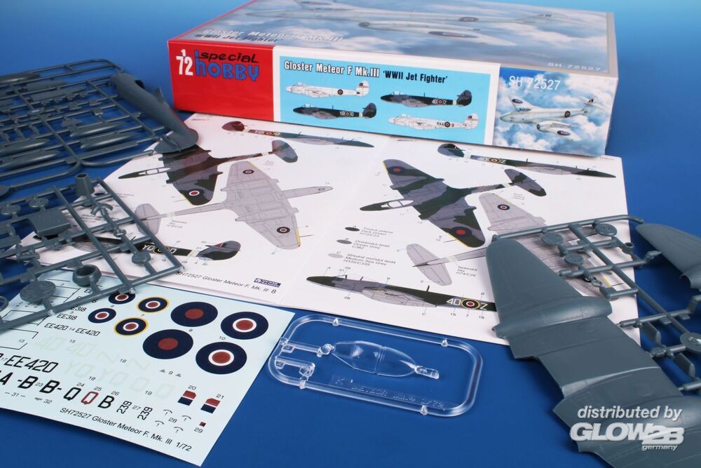 Die Mk.III Meteor war die zweite Serienversion des ersten britischen Düsenjägers und wurde noch vor Kriegsende bei der RAF in Dienst gestellt. In den Nachkriegsjahren flogen die Mk.III Meteors für kurze Zeit bei den Frontstaffeln der RAF.Der Bausatz enthält drei graue Kunststoffspritzgussrahmen und einen Spritzgussrahmen mit klaren Teilen. Der Decalbogen enthält Markierungen für zwei Kriegsflugzeuge und zwei Flugzeuge, die in der Nachkriegszeit eingesetzt wurden. Eines der Kriegsflugzeuge flog im März 1945 in Belgien und trug eine spezielle weiße Lackierung, während das andere eine standardmäßige Tarnlackierung hatte. Die gleichen Farben wurden auch bei einem der Nachkriegs-Meteors verwendet, das vierte Modell ist in der natürlichen Metallfarbe dargestellt.- Neuauflage eines interessanten Bausatzes- Attraktive Tarnfarben und Decals für Flugzeuge aus dem Zweiten Weltkrieg und der Nachkriegszeit