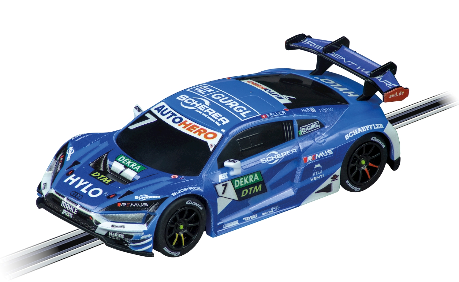 Der Audi R8 LMS ist in der GT3-Version das Spitzenprodukt im Programm von Audi Sport customer racing. Weltweite Gesamtsiege bei wichtigen Langstreckenrennen und namhafte Titelerfolge prägen seine eindrucksvolle Bilanz in der GT3-Kategorie, in der er in vielen Rennserien weltweit zum Einsatz kommt - von der Intercontinental GT Challenge und der GT World Challenge Europe bis zu nationalen und regionalen Meisterschaften sowie im Club-Rennsport. 2022 belegte das Team Abt Sportsline mit diesem Fahrzeug die Ränge 9 (Kevin van der Linde) und 15 (Ricardo Feller) in der DTM. Auch auf der heimischen Carrera GO!!!- oder GO Plus-Slotcarbahn im Massstab 1:43 macht der Audi R8 LMS GT3 evo II Team Abt Sportsline, No.7 eine gute Figur und begeistert mit Spitzengeschwindigkeiten und toller Leistung.
