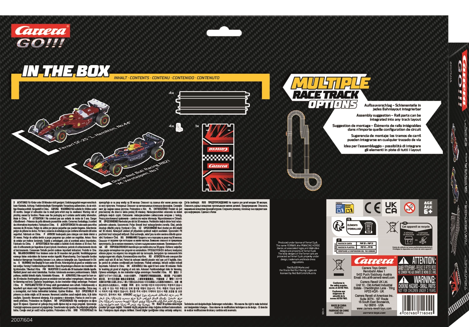 Inhalt: 1.3 Meter Schienen (4 Geraden à 34.2 cm) und zwei Formel 1-Fahrzeuge (64280 Oracle Red Bull Racing RB21 Max Verstappen No. 1 & 64282 Ferrari SF-25 Lewis Hamilton No. 44)