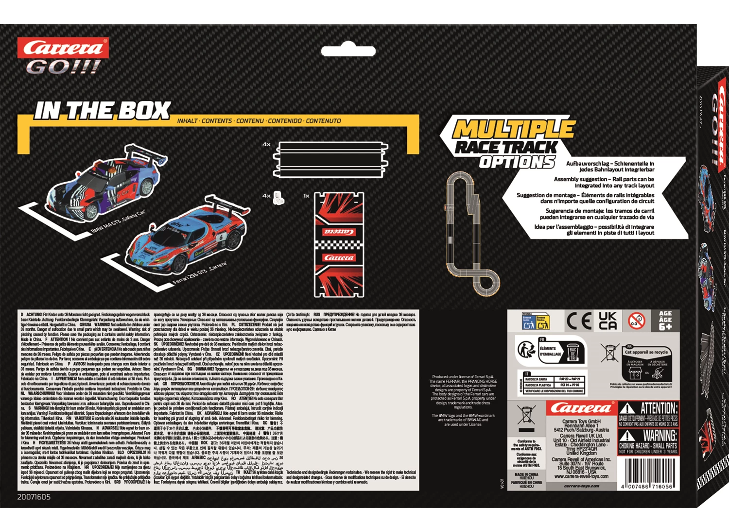Inhalt: 1.3 Meter Schienen (4 Geraden à 34,2 cm) und zwei GT3-Fahrzeuge (64247 BMW M4 GT3 Safety Car & 64274 Ferrari 296 GT3 Carrera)