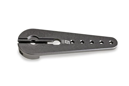 Der Aluminium Servoarm 25 T 25 mm ist der Standard Servoarm für alle Bereiche. Der Zahnkranz ist präzise gefertigt und sorgt für spielfreien Abtrieb am Servo. Problemlos erreichen Sie mit einem normalen Gabelkopf immer noch einen maximalen Ausschlag von 40° an der innersten Bohrung am Servoarm.