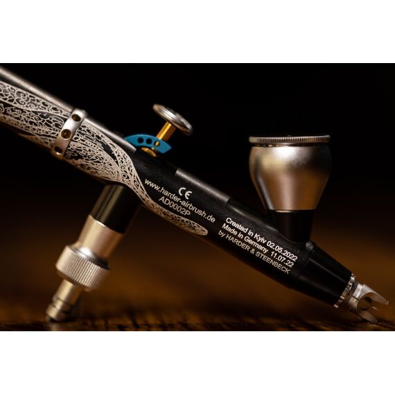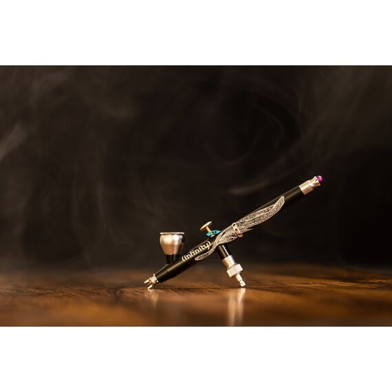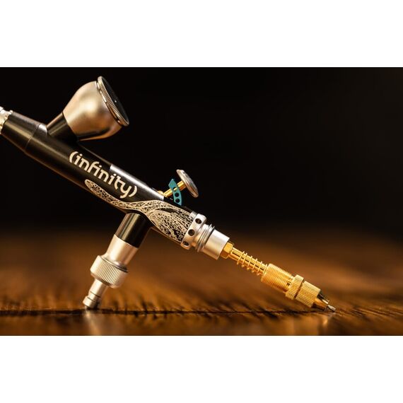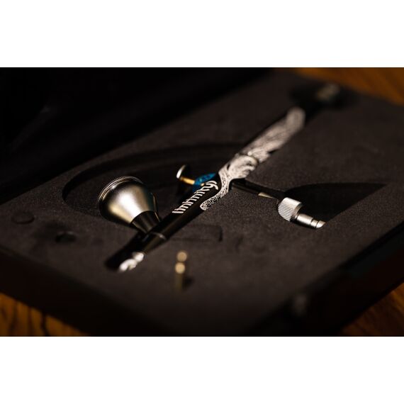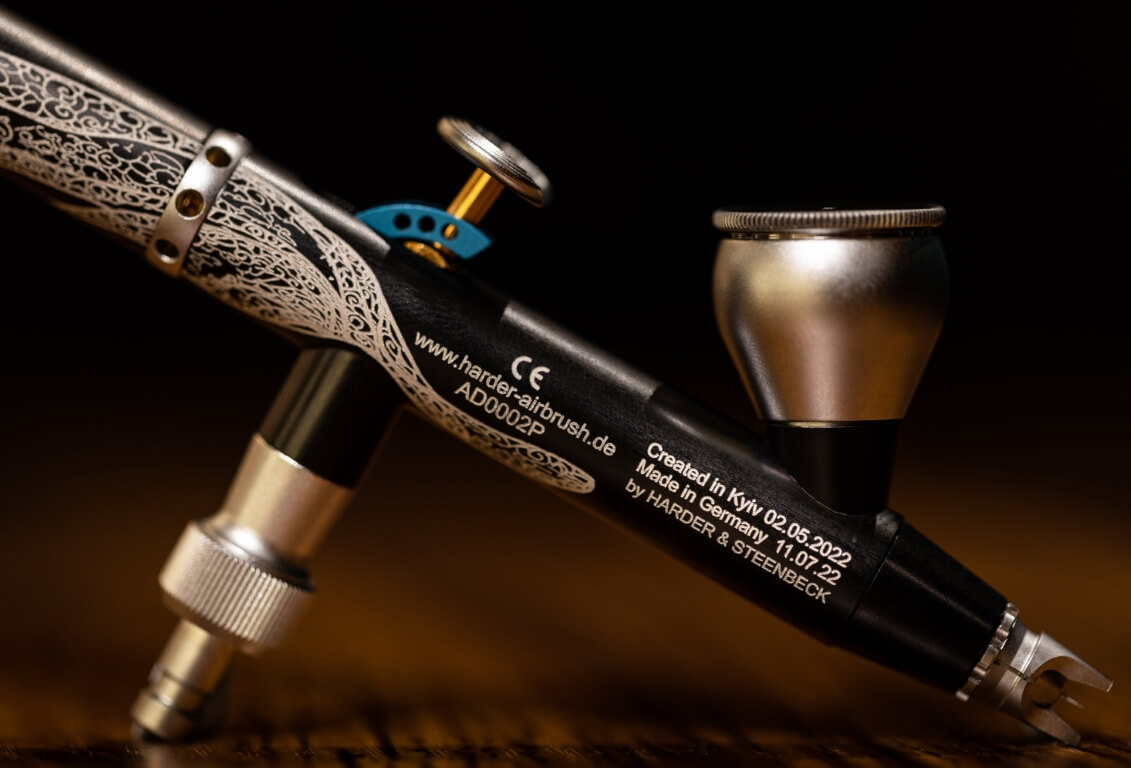 The Kyiv Infinity Dark, suitable for a beginner or an expert, can be used for everything from miniature painting to scale modelling, from fine art to murals, from make-up to automotive. It comes with the Fineline nozzle set in 0.2mm and a 2ml paint cup suitable for fine work, with the 0.4mm Fineline nozzle set and 5ml paint cup available for larger work (optional extra - see above). Beginners will love the ease of use of the 0.4mm head, and also the trigger memory feature of the Quick-Fix system which helps make fine control simple. The airbrush has all the features of the flagship Infinity CRPlus model, with the added benefit of the lightweight aluminium ALPlus construction. It carries Angela Dmitrenko's Wings artwork, and every internal part of the airbrush finished in gold as a tribute to her and our belief that there is good inside us all. Enjoy Harder & Steenbeck's German quality and performance, along with their legendary ease of use, whilst making a contribution to looking after the children of Ohmatdyt Children's Hospital in Kyiv, Ukraine. It is beautiful, but like all Harder & Steenbeck products, it is made to work hard!