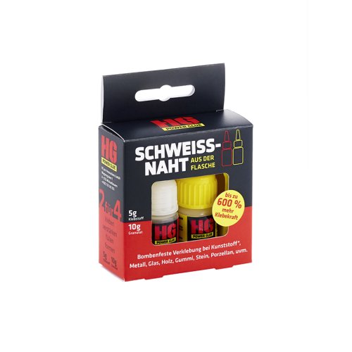 Dieses Klebstoffreparaturset bestehend aus einem extrem starken Industrieklebstoff HG-Extreme 1.0 und einem Granulat, die perfekt aufeinander abgestimmt sind. Erst die Kombination der beiden Komponenten führt zu einer chemischen Reaktion, die eine unbeschreibliche Klebekraft entfesselt und eine Schweißnaht formt. Geeignet für Freizeit, Industrie, Haushalt und Werkstatt. Verschweisst Bruchstellen, Risse, Sprünge und füllt Löcher und Spalten. Für fast alle Materialien geeignet. Die Schweissnaht ist hochklebend, witterungsbeständig, kälte- sowie hitzebeständig (von -45 bis +115 ° C) und darüber hinaus wasserfest. Sie kann geschweisst und lackiert werden.