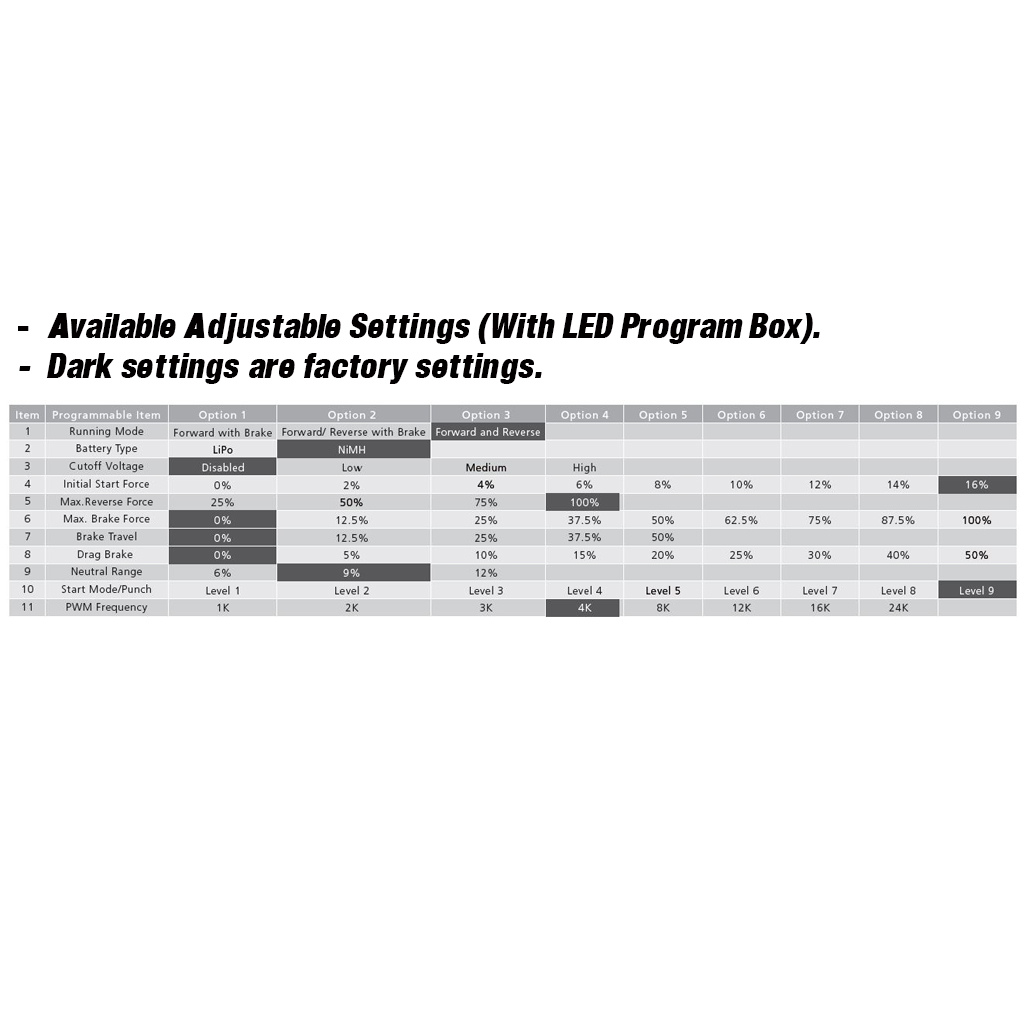 Dieser Fahrtenregler verfügt über eine automatische Gaskalibrierung. Weitere Einstellungen können über die LED-Programmierbox HW30501003 vorgenommen werden.