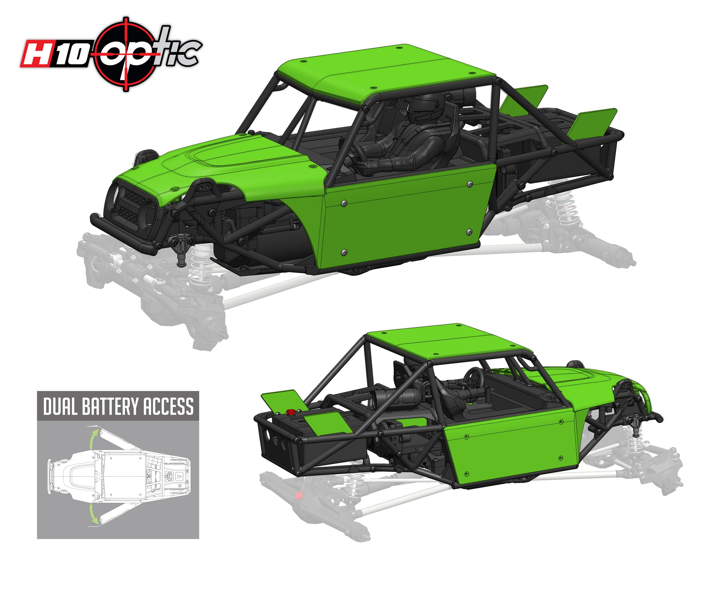 The styling of the H10 chassis is derived from Trail Buggy’s built to tackle the world's toughest terrain in comfort and style. The 2-seat symmetrical design preserves a narrow overall width for easy navigation around obstacles. Short front and rear overhangs optimize approach and departure, allowing tires to hit obstacles first.