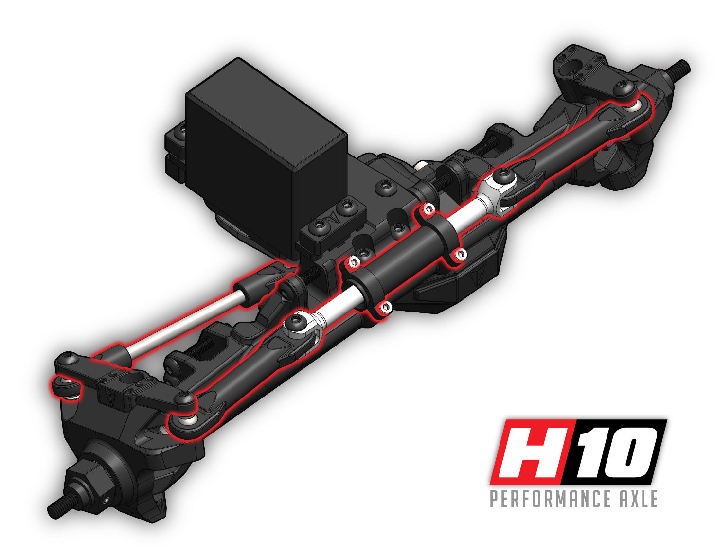Scale appearance meets performance with the new H10 Hydro Front Axle steering system. Developed to simulate a double ended hydraulic ram steering system used in off-road rigs. Utilizing a standard steering servo hidden behind the axle, the steering system is isolated from the chassis. The H10 Hydro front axle uses a 3pc ram that is protected and moved away from obstacles. The width of the H10 axle is increased by 0.600" compared to the F10 for even greater stability.