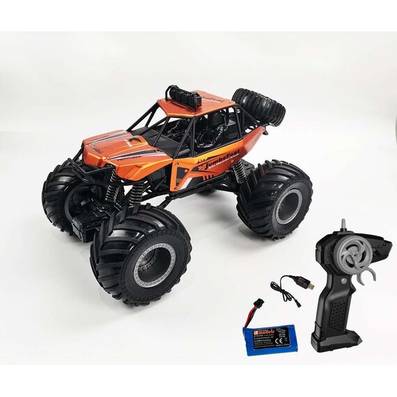 Der DF Models Jumbo Foot V2 Off-Roader 1:10 RTR ist ein imposanter XXL Monstertruck mit riesigen Luftreifen, der im Maßstab 1:10 gehalten ist. Mit seiner metallicfarben lackierten Metallkarosserie ist dieses Modell ein echter Blickfang! Dank des beiliegenden LiIon Akkus können Sie über 30 Minuten lang ununterbrochenen Fahrspaß genießen, abhängig von der Fahrweise und dem Gelände, auf dem Sie unterwegs sind. Die 2,4 GHz Fernsteuerung ermöglicht es, mehrere Modelle gleichzeitig parallel und ohne Störungen zu betreiben. Das eingebaute Soundmodul und die LED-Beleuchtung sorgen für zusätzliche Action und Spaß. Einfach auspacken, den Akku aufladen, Batterien (nicht im Lieferumfang) in den Sender einlegen und schon kann das Abenteuer mit dem RC-Car auf Parkplätzen und Wegen starten! Dieses Modell ist der ideale Einstieg in den RC Modellbau und eignet sich perfekt für Fahrer ab 6 Jahren. Gönnen Sie sich und Ihren Kindern mit dem DF Jumbo Foot V2 Truck ein unvergessliches RC-Erlebnis in XXL-Format!