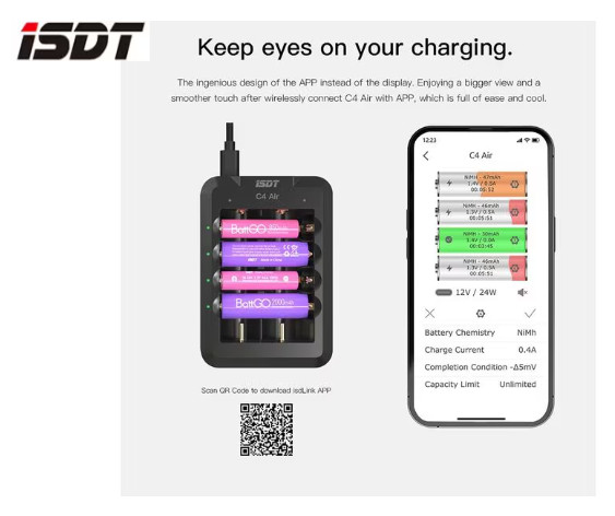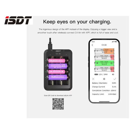 Stromversorgung: USB-C 5 - 12 V DC (unterstützt QC Quick Charge und PD Power Delivery)Bedienung per IsdLink App am SmartphoneUnterstützt Akkugrössen: AAA, AA, 10440.10500, 12500, 13500, 14500, 14650, 16650, 17650, 17670, 18650, 18700, 20650, 20700, 21700, 22650, 26650, 26700Unterstützt Akkutypen: NiMH, NiZn, Li-Ion, LiFe, LiHvVerpolungssicherDimensionen: 106 x 73 x 29 mm