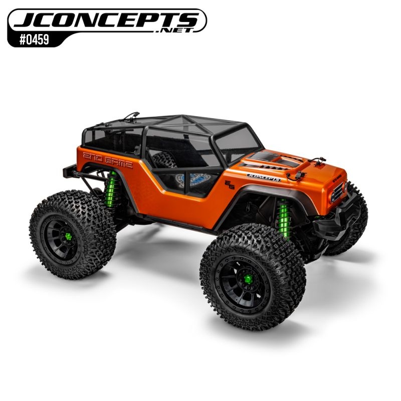 Bei einem Offroad-Fahrzeug sind Langlebigkeit und Funktionalität von entscheidender Bedeutung. Die Designer von JConcepts haben daher das robuste Karosseriedesign mit der markanten Front- und Heckpartie enthüllt. Das offene Cockpit mit dem massiven Überrollbügel entstand aus der gemeinsamen Entwicklung von Strategien, um die Aufprallfestigkeit zu optimieren und gleichzeitig die Sicht zu verbessern. Maximale Fensterflächen und massive Verstärkungen schützen das End Game vor den Herausforderungen postapokalyptischer Schlachten. Die Motorhaube verfügt über Lüftungsschlitze und eine Lufthutze mit tiefen Lufteinlässen.