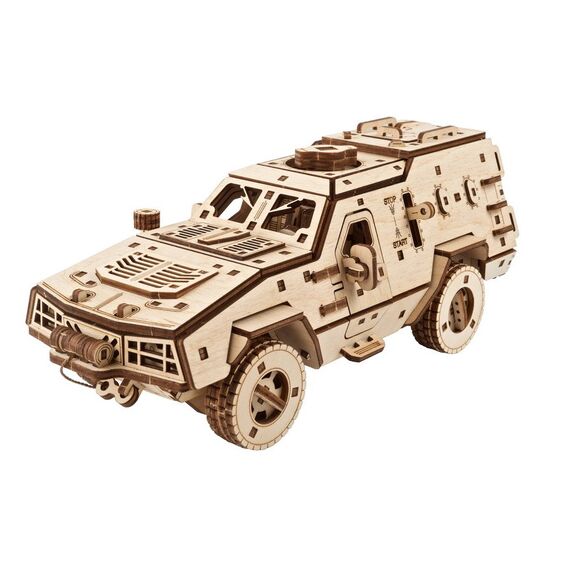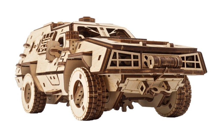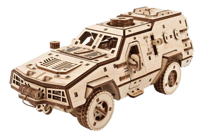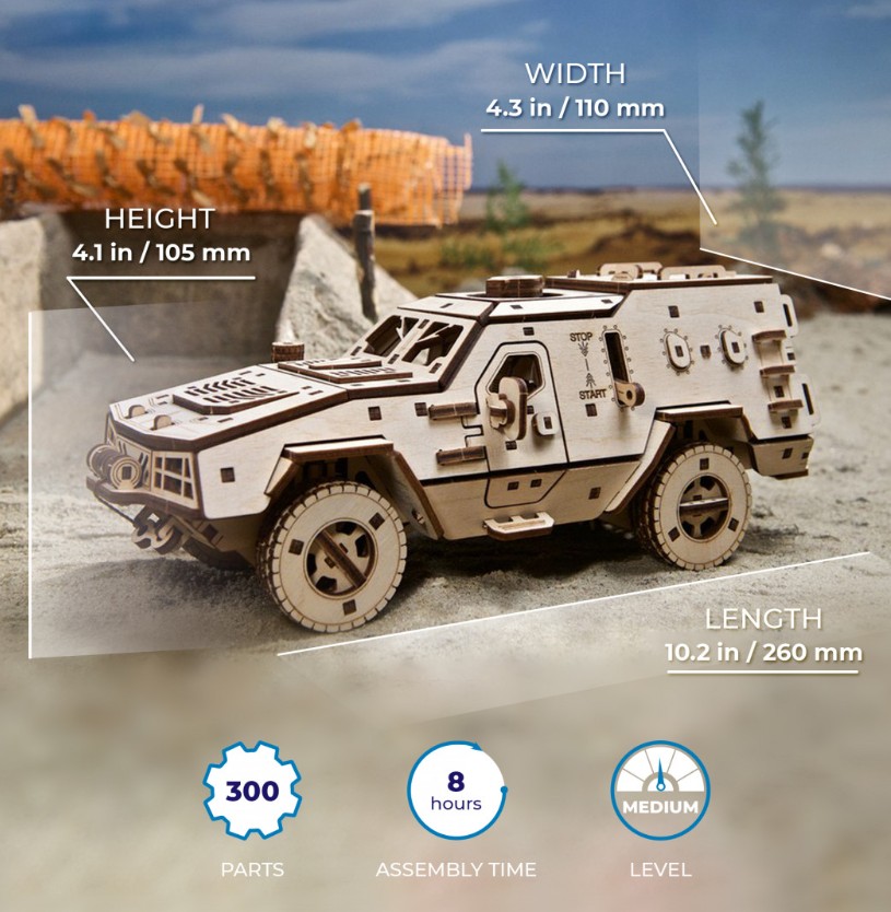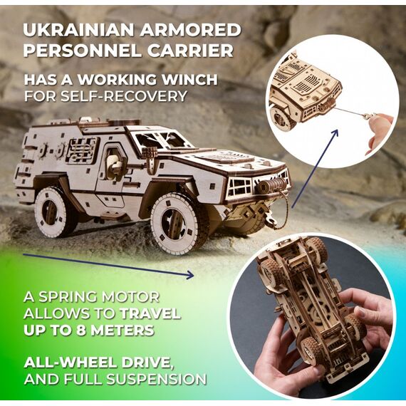 Dieser Holzbausatz eines gepanzerten Mannschaftstransportwagens der ukrainischen Streitkräfte ist ein lohnendes Modellbauprojekt und ein originelles Geschenk für Liebhaber/innen militärischer Modelle, der Militärgeschichte, von Lastwagen mit Allradantrieb oder Kampffahrzeugen, sowie für alle, die die Ukraine in ihren Bemühungen unterstützen, angesichts der russischen Aggression unsere Freiheit und Unabhängigkeit zu bewahren. Ein Teil der Einnahmen für jedes über unsere internationale Website gekaufte Modell des Kampffahrzeugs Dosor-B wird für Hilfsmaßnahmen und die Verteidigung der Ukraine gespendet.