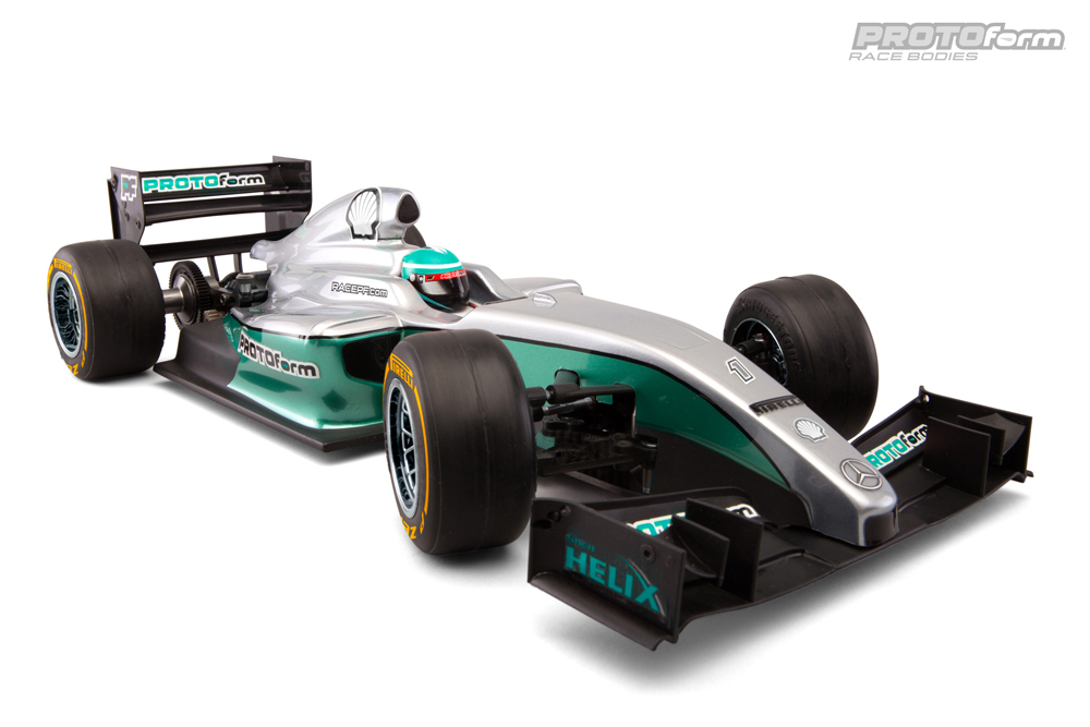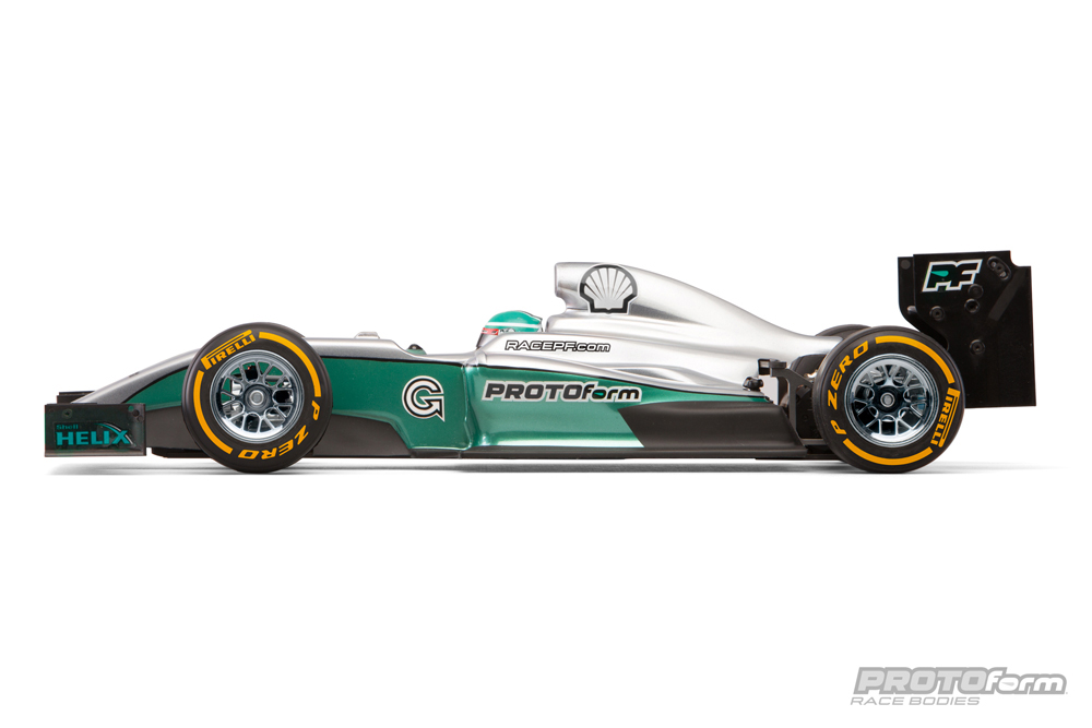 The F1-Fifteen fits most modern F1 chassis* with trimming for front and rear suspension. This body is produced in genuine .030" (0.7mm) Lexan, is Made in the U.S.A. and includes decal sheet, driver helmet, hardware and paint-then-peel overspray film.