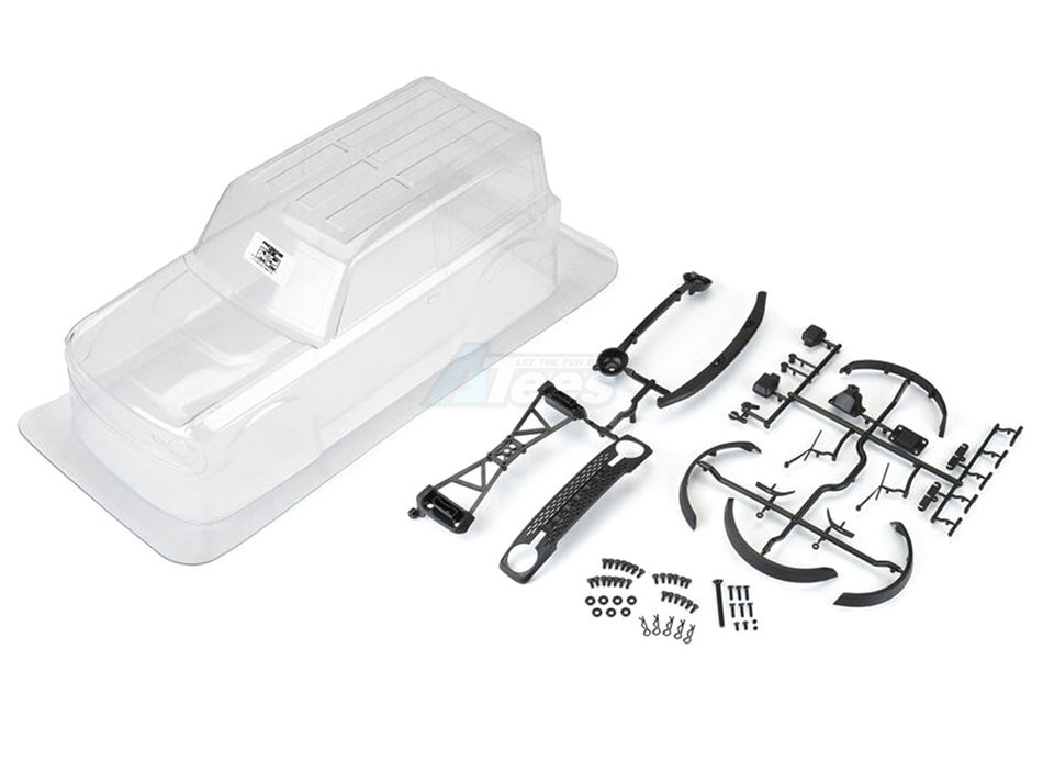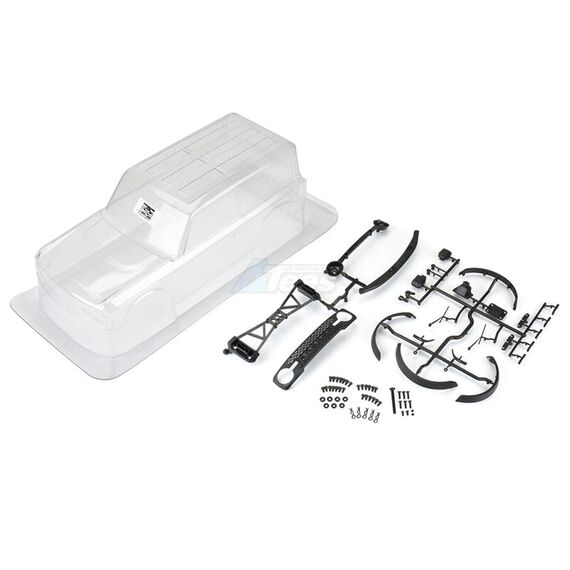 Pro-Line has once again raised the bar for scale accessory details on a polycarbonate body, including molded black plastic front grill, fenders, mirrors, door handles, and wipers. The spare-tire holder allows you the option to mount a spare crawler tire to the rear, while the headlight & taillight buckets allow for LED lighting (sold separately) to set off your scale rig. This single-piece body is made from durable, crystal-clear material that can be painted to match your favorite factory Ford® Performance livery or whatever your heart desires.