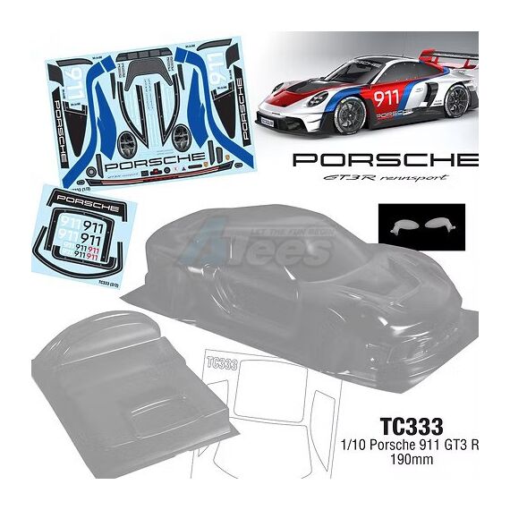 1/10 Porsche 911 GT3 R WB 258mm Width 190mm Clear Lexan Body W/Rear Wing With Light Buckles and Mirrors Incl: 911 GT3 Decal Sheet Window Mask