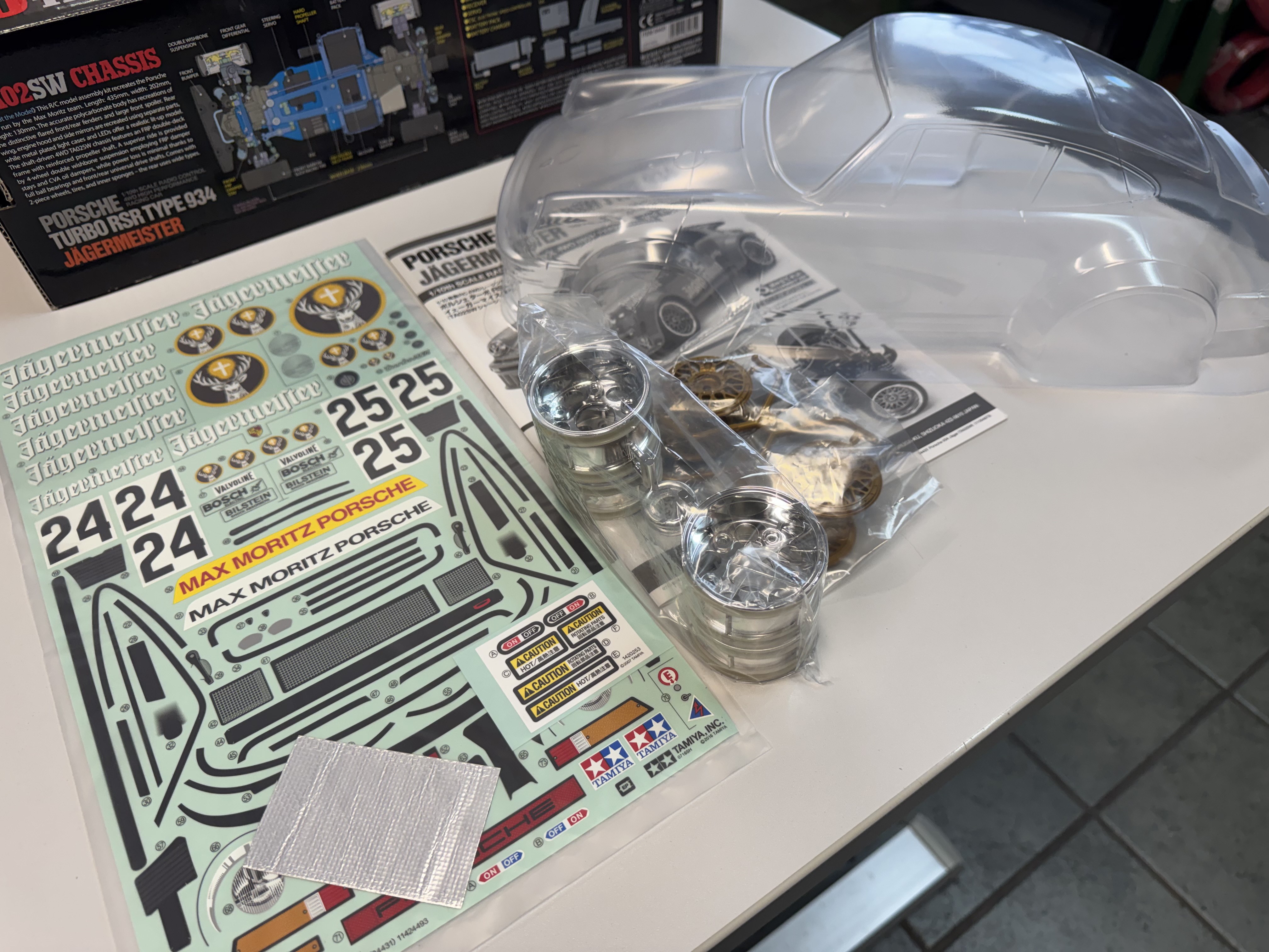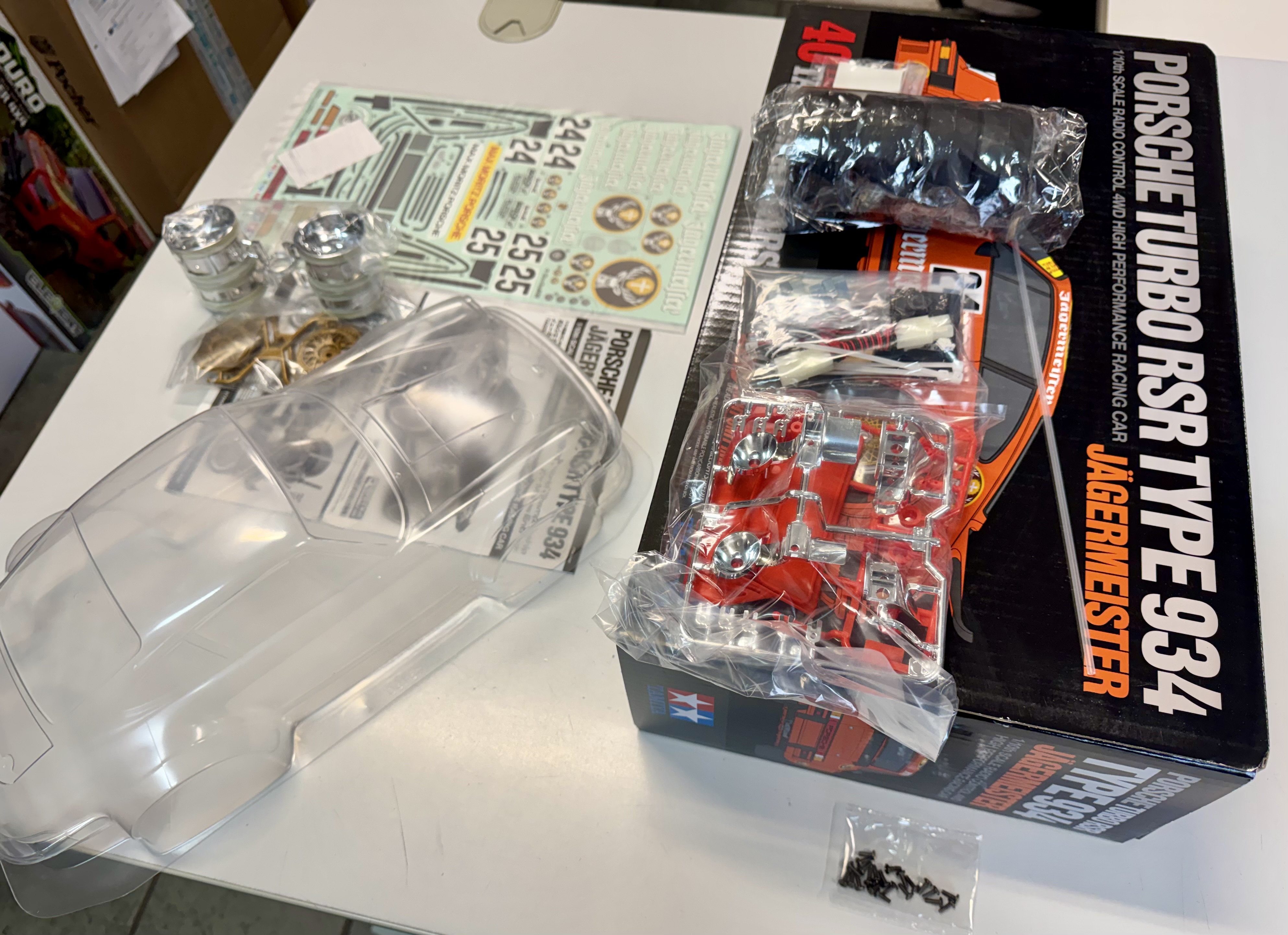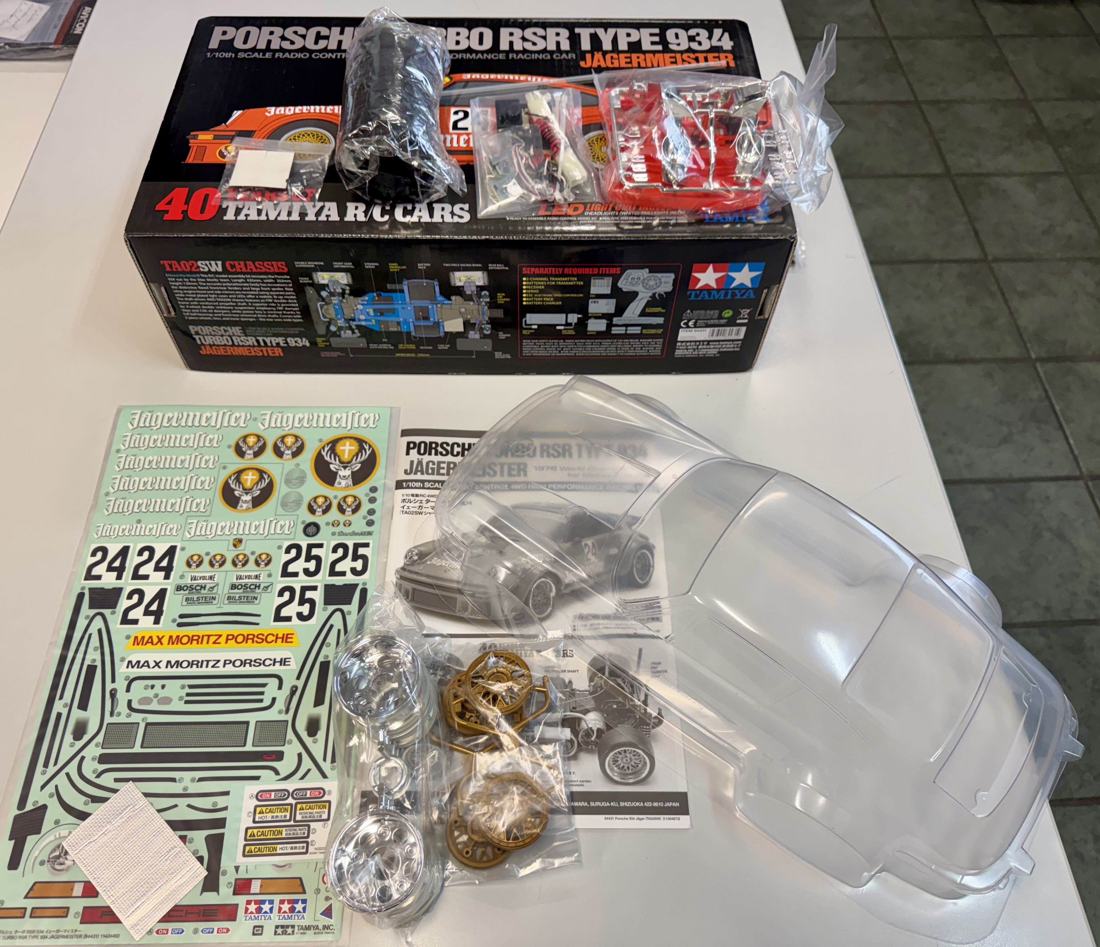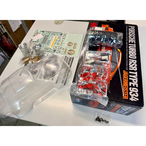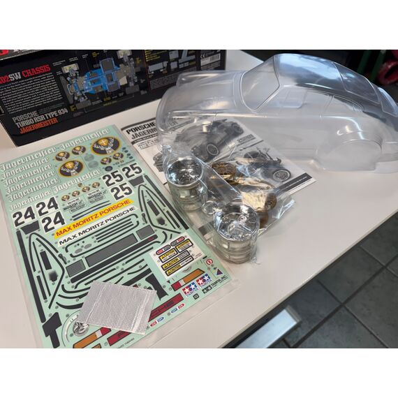 Rarität! Karosserie Set auf dem 40th Anniv. Porsche 934 Bausatz von Tamiya! Inkl. Decals, Beleuchtungssatz, Anleitung, Reifen und Felgen.
