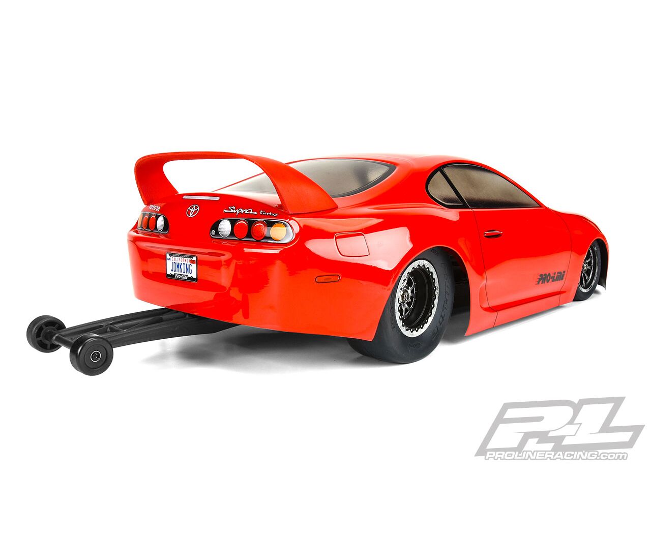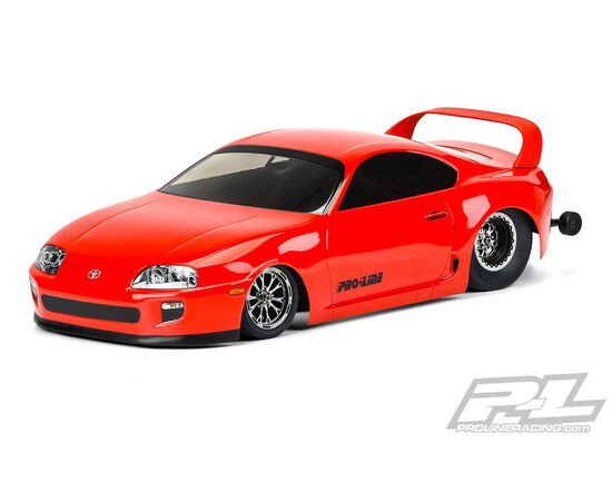Pro-Line is proud to introduce the car culture phenomenon 1995 Toyota Supra clear body to the no prep drag racing scene. All the iconic rounded shapes of the full-size car have faithfully recreated in 1/10 scale size and tuned specifically for drag racing. Pro-Line even includes separate headlight buckets to accurately replicate the 3-dimensional depth of the 1995 Supra headlights. The body features a unique tuner-style raised rear wing that is lifted by the included molded black plastic wing struts to complete the iconic Supra styling. Or you can 3D print your own OEM style Supra Spoiler using the design file provided by Pro-Line at the link below. Get your own 1995 Toyota Supra Clear Body for Drag Racing today!