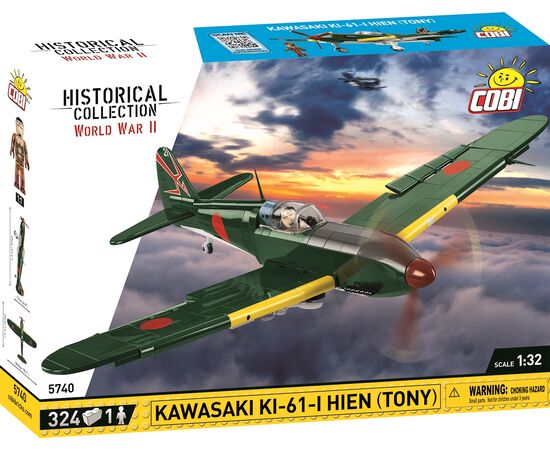 Die Kawasaki Ki-61 'Hien' (deutsch: Schwalbe) war ein einmotoriges Jagdflugzeug der kaiserlich japanischen Heeresluftstreitkräfte und wies in der Konstruktion starke Ähnlichkeiten mit dem zweimotorigen Standardbomber Heinkel He 111 und dem einmotorigen Jagdflugzeug He 112 der deutschen Luftwaffe auf. Beide Typen hatte das japanische Militär aus Deutschland zugekauft und intensiv getestet. Als Bordwaffe erhielt die Hien (alliierter Codename: Tony) zwei ebenfalls deutsche 20 mm-Kanonen und zwei MG-151 der Firma Mauser. Die Ki-61-I, die erste von vielen weiteren und verbesserten Varianten, kam im Sommer 1942 zu den Kampfverbänden und wurde bei Gelegenheit auch als Jagdbomber eingesetzt. Sie konnte zwei 250 kg-Bomben unter den Tragflächen mitführen. Modell mit 324 Teilen, 1 Figur, bedruckten Blöcken und beweglichen Elementen. Modellmasse (LxBxH): 29 x 38.5 x 11 cm