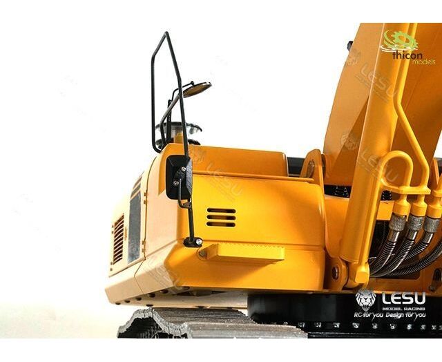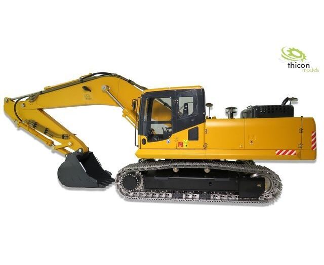 Präzise gefertigter Bagger-Bausatz aus Metall mit Hydraulik. Der Kettenbagger ist überwiegend aus Edelstahl hergestellt. Der Kettenantrieb erfolgt über zwei kräftige Brushlessmotoren, die direkt in den Naben eingebaut sind. Die elektrischen Anschlüsse der Motoren erfolgt über einen mechanischen Drehdurchtrieb, der ein Endlosdrehen des Oberwagens erlaubt. Die neue Hochleistungs-Hydraulikpumpe verfügt über ein eingebautes Manometer zur Drucküberwachung. Das Hydrauliksystem verfügt sogar über einen Ölkühler mit Aktiv-Lüfter. Serienmäßig kommt der Baggerbei thicon-models mit einem 6-fach-Hydraulik-Steuerblock! Die Hydraulikzylinder sind mit Messingrohren versehen.