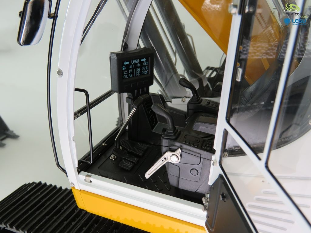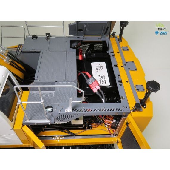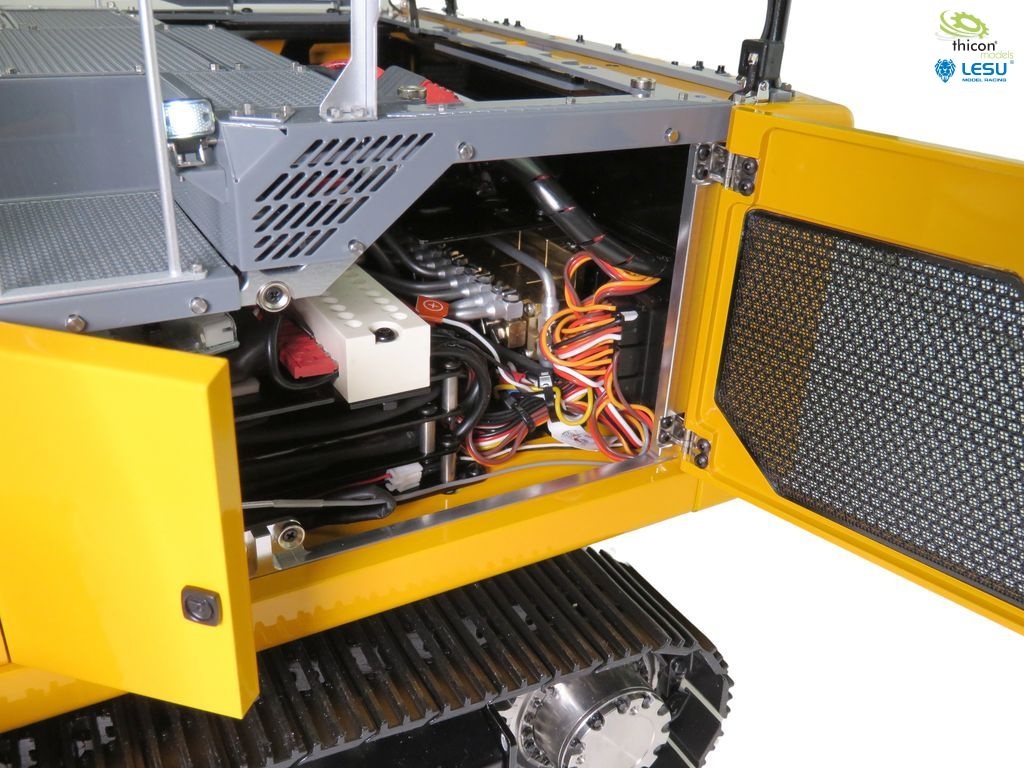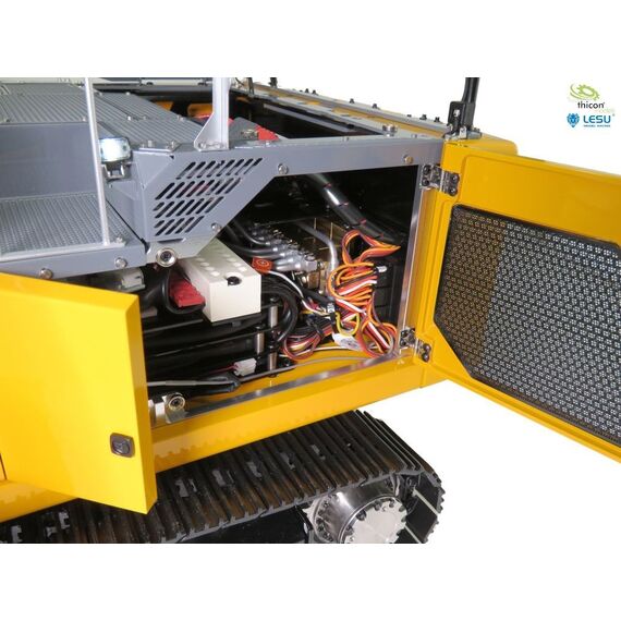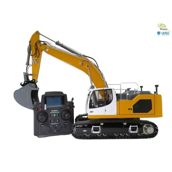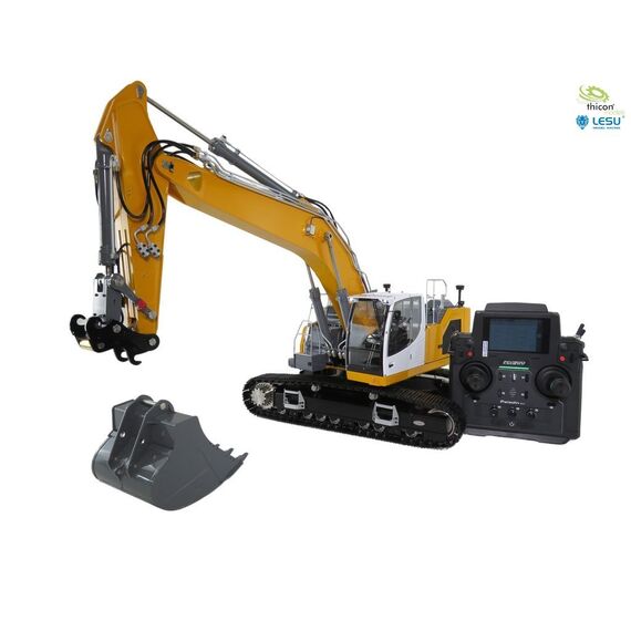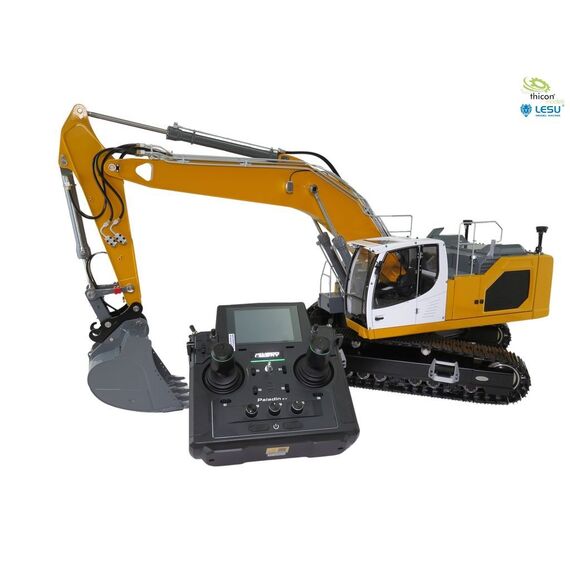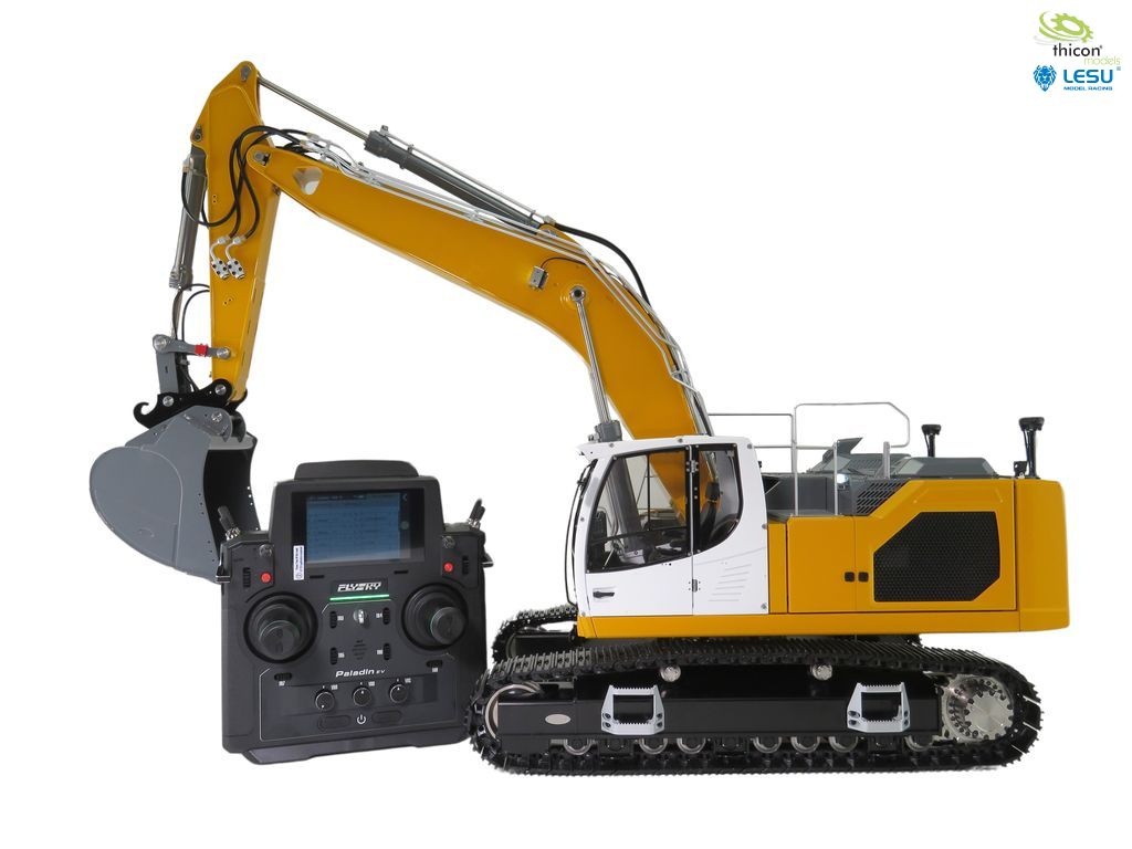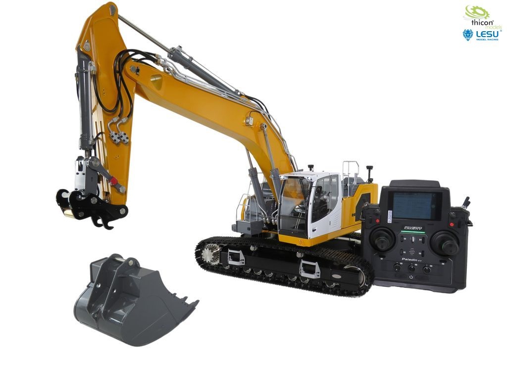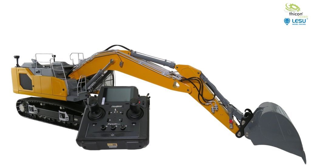 Bagger fertig aufgebaut und in gelb lackiert, fertig eingestellt und fahrbereit mit FlySky Paladin PL18EV flag, Hydraulikanlage mit Brushless-Pumpe, Ölkühler, 6-fach-Steuerventil, Motoren, Regler, Servos, Bauanleitung.