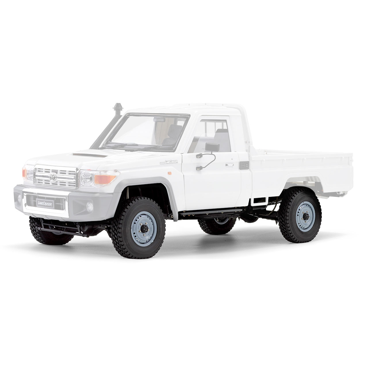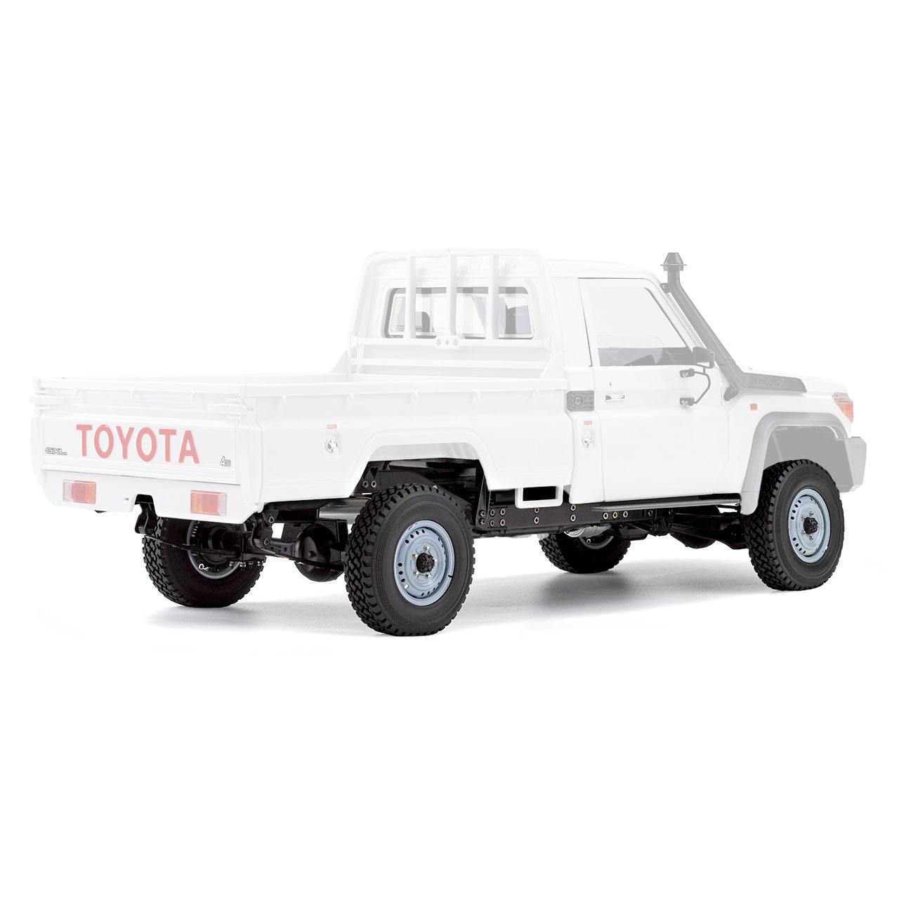 Abmessungen: 490mm x 200mm x 130mm Böschungswinkel: 43 Grad Abfahrtswinkel: 33 Grad Rampenüberfahrtswinkel: 22 Grad Chassis-Abmessungen (montiertes LC70 #48601): 520mm x 200mm x 200mm Böschungswinkel des Chassis (montiertes LC70 #48601): 37 Grad Abfahrtswinkel des Chassis (montiertes LC70 #48601): 33 Grad Rampenüberfahrtswinkel des Chassis (montiertes LC70 #48601): 22 Grad Radstand: 313mm Reifen: 23mm x 83mm 1,68-Zoll-Felge Radnabenadapter: 12mm Spurbreite (v/h): 173mm/170mm Mindestbodenfreiheit: 25mm Batterietank: 93mm x 44mm x 18,5mm Vormontierte Vorder-/Hinterachse und Getriebe Gewicht: 1500g