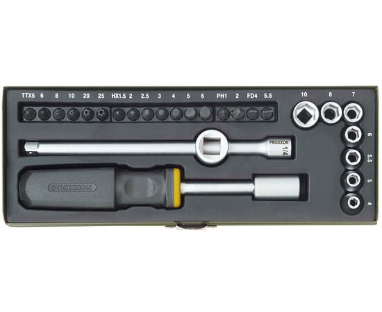 Vierkant in der Stirnseite des Griffes. Bits aus hochlegiertem Spezialstahl (TX mit stirnseitiger Bohrung). Sonstiger Inhalt siehe Abbildung.