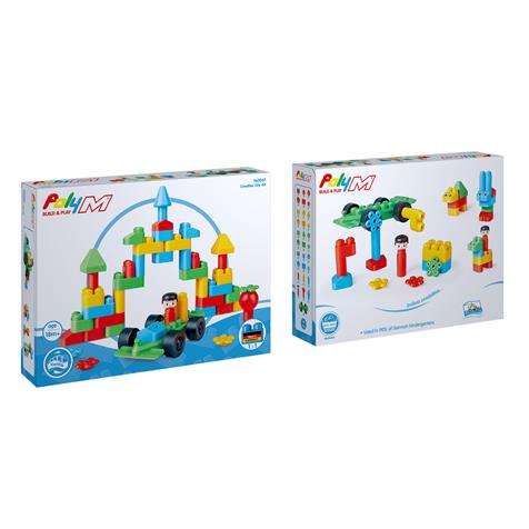 Das Kreative City-Set enthält 49 PolyM-Blöcke, zwei Bögen Augen-Aufkleber, ein vorgefertigtes Fahrzeug, Bauanleitungen und eine Broschüre.