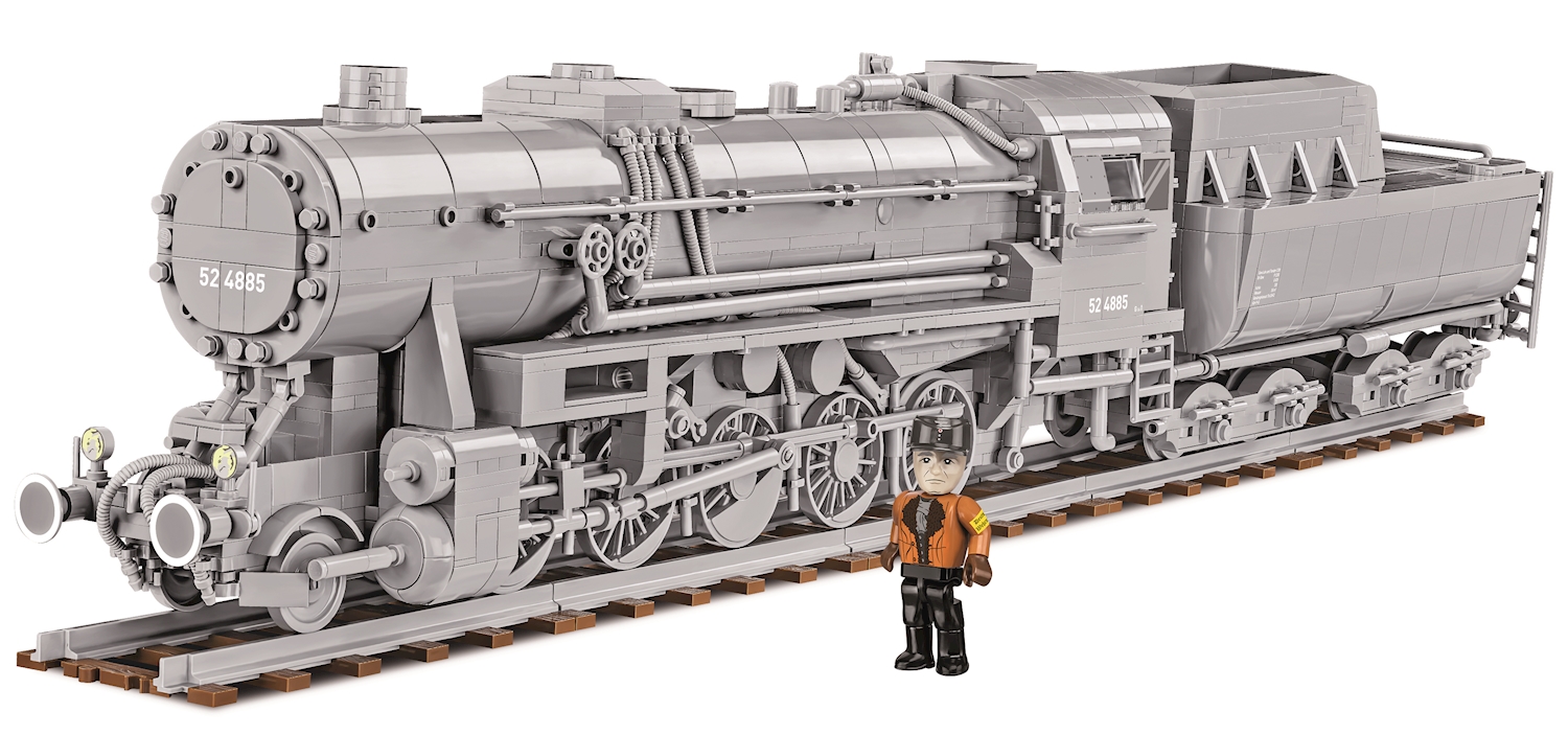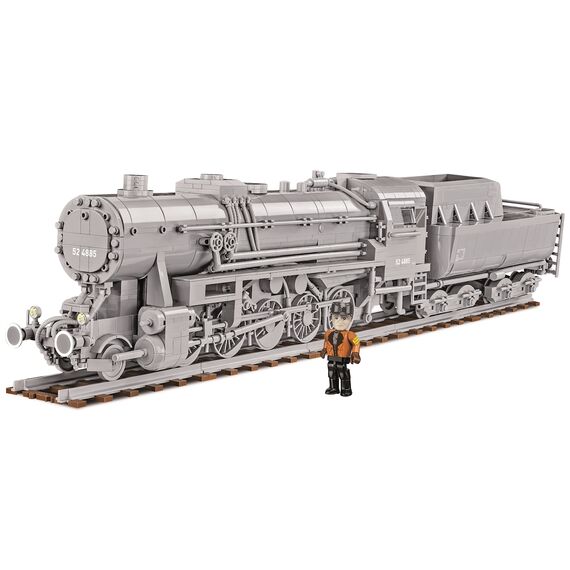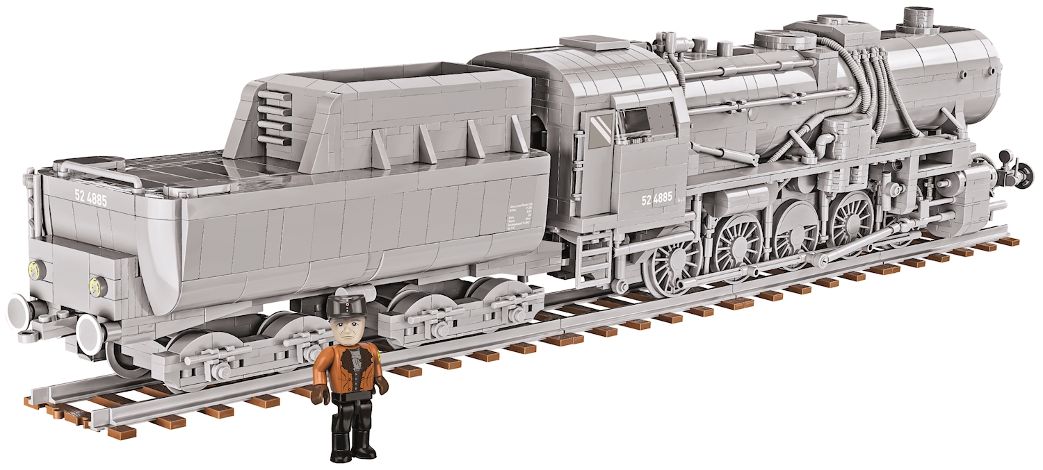 Die Dampflokomotiven der Baureihe 52 sind die bekanntesten sogenannten Kriegslokomotiven der Deutschen Reichsbahn. Ab 1942 wurden mehr als 7000 Exemplare davon gebaut, 1943 an manchen Tagen bis zu 50 Stück. Die BR 52 war einheitlicher konstruiert und bestand aus weniger Teilen, als Vorgängermodelle. Sie sollte möglichst schnell, mit geringem Materialaufwand und aus weniger Teilen hergestellt werden und auch den extremen Temperaturen eines russischen Winters widerstehen können. Ursprünglich ausgelegt für eine Nutzungsdauer von maximal 10 Jahren, wurden einzelne Maschinen schliesslich 50 Jahre und länger eingesetzt. Die Lok verfügte über einen komplett geschlossenen Führerstand (Norweger-Stand) und einen für diese Baureihe angepassten Wannentender mit einem Fassungsvermögen von 30 m3 Wasser und 10 t Kohle. Auch nach dem 2. Weltkrieg war diese Lok in verschiedenen Ländern im Einsatz. In der Bundesrepublik Deutschland wurde sie erst ab 1989 nicht mehr fahrplanmässig eingesetzt. Modell mit 2476 Teilen, 1 Figur, 5 geraden Schienen zu ca. 13 cm (kompatibel mit Geleisen anderer Klemmbausteinmarken) und bedruckten Blöcken. Modellmasse (LxBxH): 67 x 10 x 14 cm