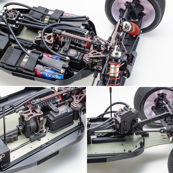 Der ESC (Geschwindigkeitsregler) ist am Chassis mit einer speziellen Halterung für eine einfache Installation/Entfernung und Wartung befestigt. Radiobox ist auch enthalten, um empfindliche Geräte wie Empfänger und Laptimer zu montieren.