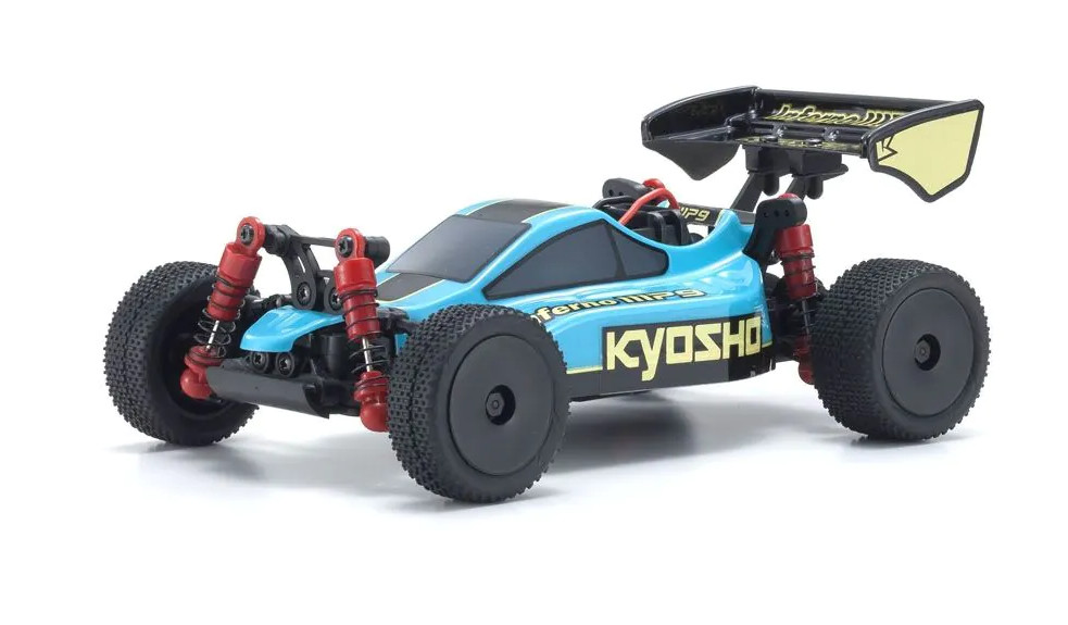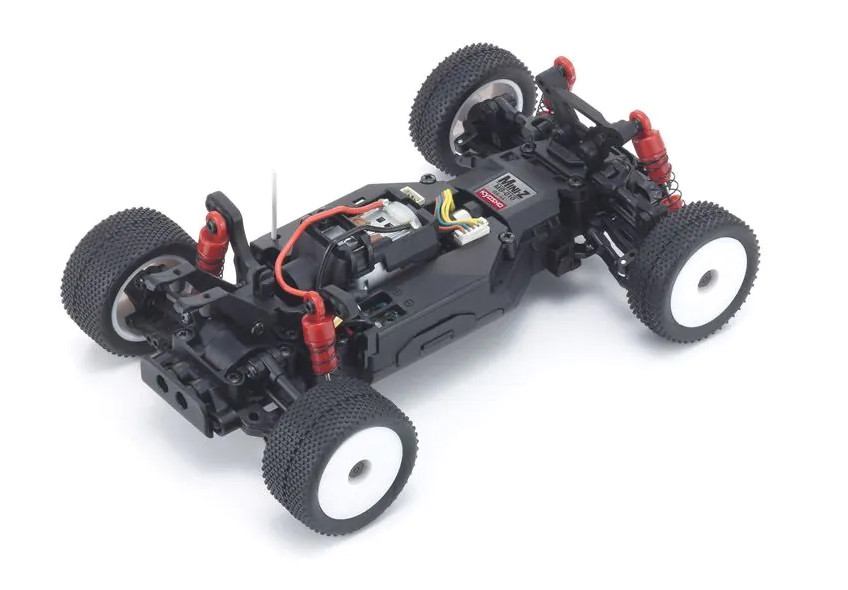 The MINI-Z Buggy Readyset is a palm-sized R/C car that you can play with by purchasing 8 AAA batteries separately. A 4WD drive train with a slipper clutch that protects the gears, and a double wishbone 4-wheel independent suspension with oil dampers. The chassis exhibits excellent dust resistance and high rigidity by covering most of the important mechanisms with a shell. The steering servo, which is unique to the 7-speed gear type, is capable of full-torque, detailed control. Combined with a control program that achieves linear handling for steering, it delivers the nimble steering feel typical of the MINI-Z tradition. In addition, the left and right distribution board is equipped with a volume that can be manually adjusted by an optional gyro unit set (sold separately: see here for compatibility ) that improves straight-line stability and suppresses posture disturbance when turning. The attached printed body uses a new color that evokes the hot driving style of the Inferno MP9, which boasts the number one popularity in the MINI-Z buggy series. Anyone can enjoy full-fledged driving of a racing buggy right away with this factory-assembled Readyset. How do you like it?