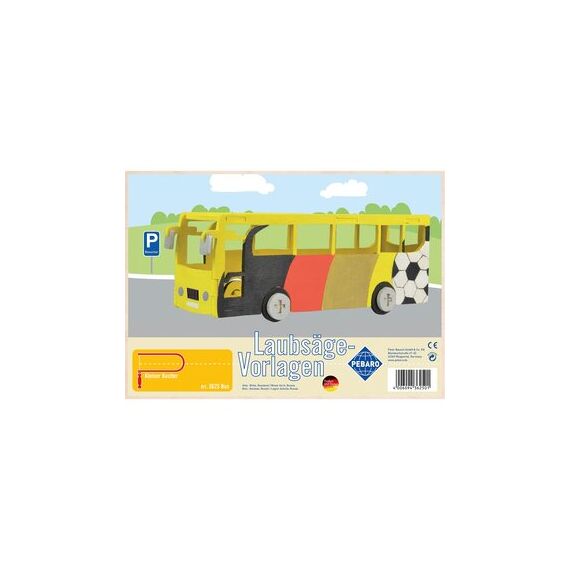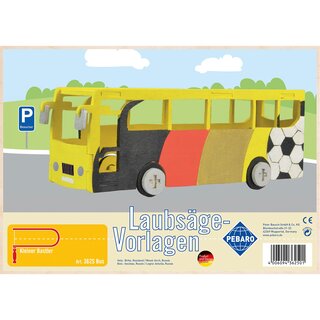 Kreative Vorlage aus Holz bedruckt mit dem Motiv Bus zum Aussägen mit der Laubsäge
