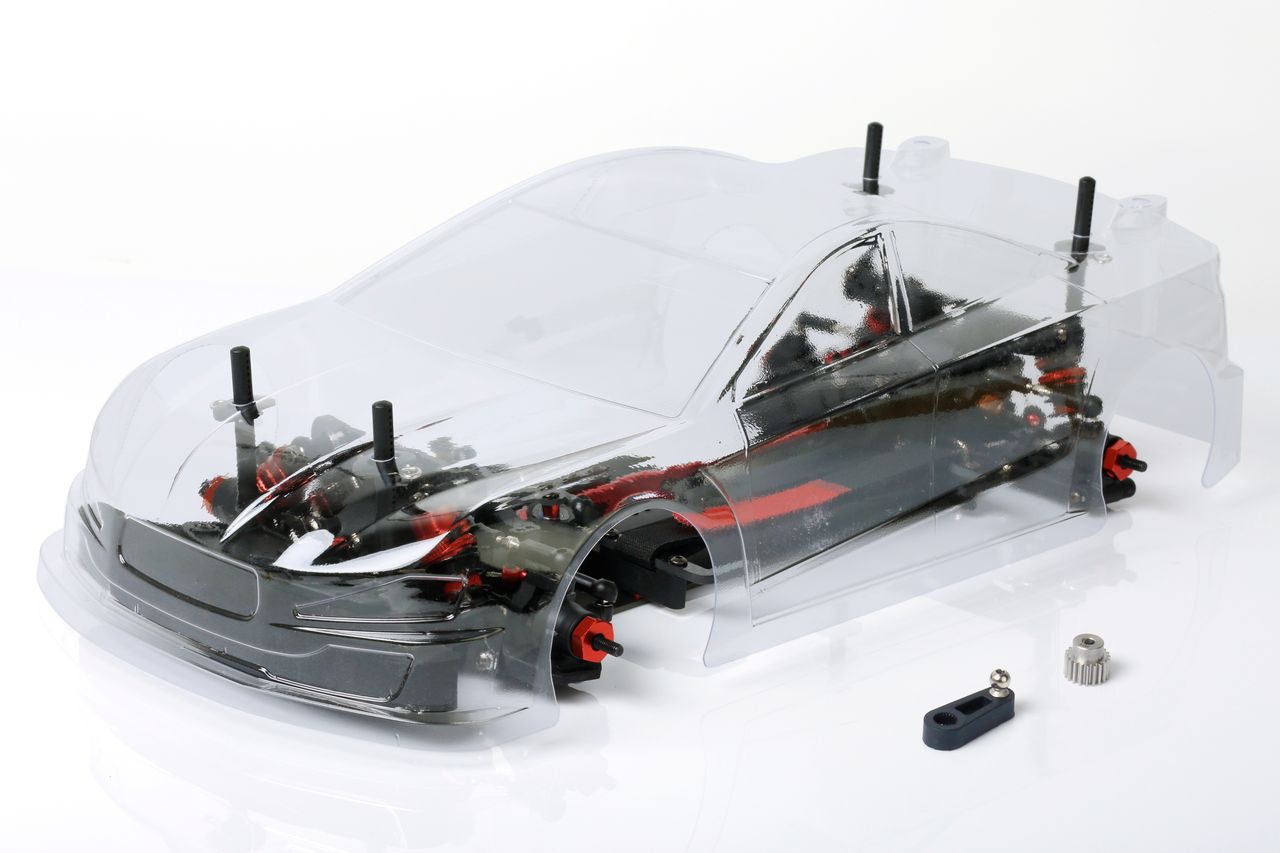 Das Kit enthält außerdem eine transparente Touring-Car-Karosserie, die Sie individuell gestalten können.