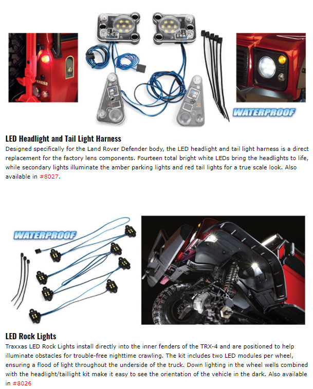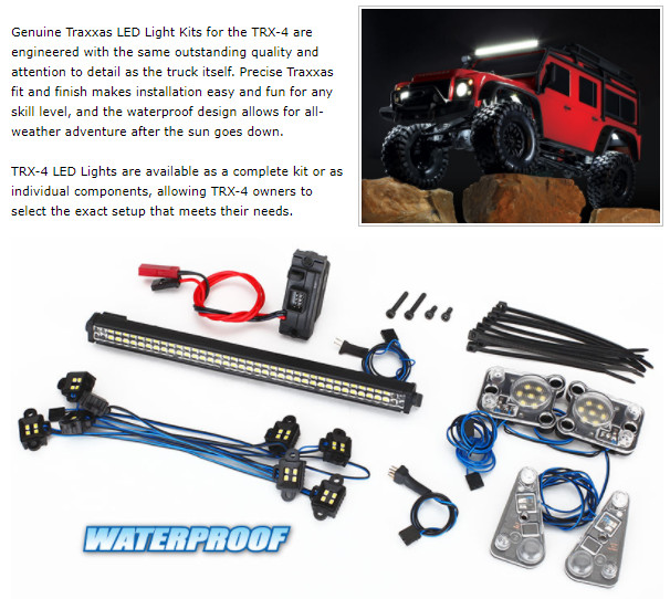 Genuine Traxxas LED Light Kits for the TRX-4 are engineered with the same outstanding quality and attention to detail as the truck itself. Precise Traxxas fit and finish makes installation easy and fun for any skill level, and the waterproof design allows for all-weather adventure after the sun goes down.