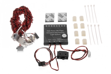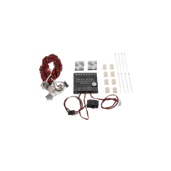 Lichter-Set mit 5mm LED mit einer extra hohen Leuchtkraft für RC Flugzeug-, Hubschrauber- und Multikopter- Modelle verwendbar auch für Schiffe insgesamt 3W. In den Grundeinstellungen simuliert es den Betrieb von Positions-, Antikollisions- und Landelichter echter Flugzeuge und Hubschrauber – verleiht so dem RC-Modell ein realistischeres Aussehen. Es enthält 8 LED Lichter mit einer extrem hohen Leuchtkraft: ein blinkendes rotes Antikollisions-Leuchtfeuer, 3 weiße Blinkleuchtfeuer, ein rotes und grünes Positionslicht, 2 weiße Landelichter.