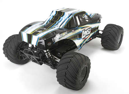 90 cm lang und 66 cm breit - der Losi 1/5 Monster Truck XL RTR. Ein auf dem DBXL basierender Allradantrieb jagt den beeindruckenden Riesen über jedes noch so unerbittliche Offroad-Gelände. Während ein leistungsstarker Dynamite 29cc Benzinmotor für Höchstgeschwindigkeiten über 50 km/h sorgt, bringen die integrierte AVC-Technologie und zwei Grossmodell-Lenkservos die Kraft des 1/5-Monsters dabei sauber auf die Strasse. Vordere Achsen aus Aluminium, Monster Truck Reifen und ViskoseDifferentiale sorgen für maximale Power wann immer Sie bereit sind den Gashebel der im Lieferumfang enthaltenen Spektrum DX2E Fernsteuerung voll durchzuziehen. Im Falle eines Zweikampfs verschaffen grosse Gewindedämpfer und verlängerte ChassisAufhängungsarme dem Losi einen Vorteil gegenüber seinem Gegner.