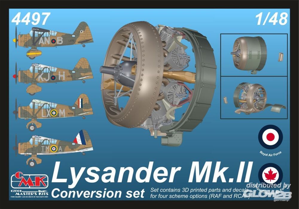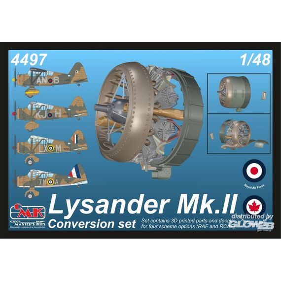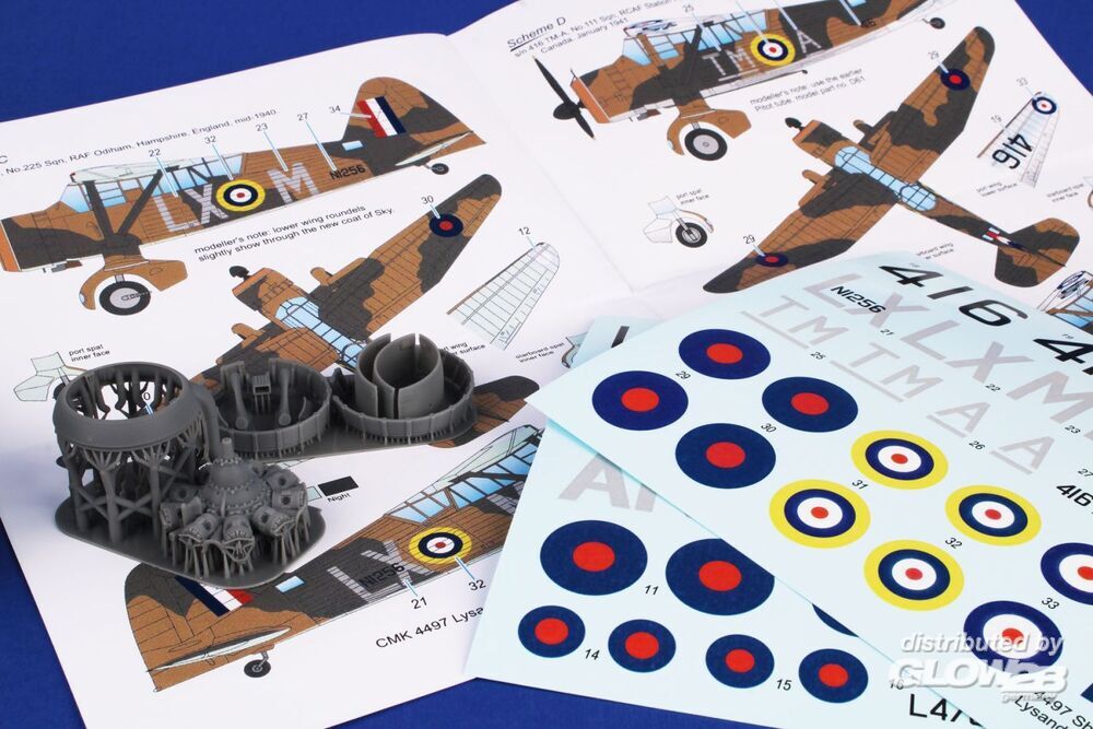 Die Lysander Mk.I/III wurden von Varianten des Bristol Mercury-Motors angetrieben, aber die Lysander Mk.II-Version erhielt den Bristol Perseus-Sternmotor. Dieser Motor verfügte auch über eine andere Motorhaube. All dies, zusammen mit den Abziehbildern, wird in diesem 3D-gedruckten Set angeboten. Die Abziehbilder zeigen drei RAF-Flugzeuge, die in Europa und auf den Britischen Inseln im Einsatz waren, sowie eines der kanadischen RCAF.