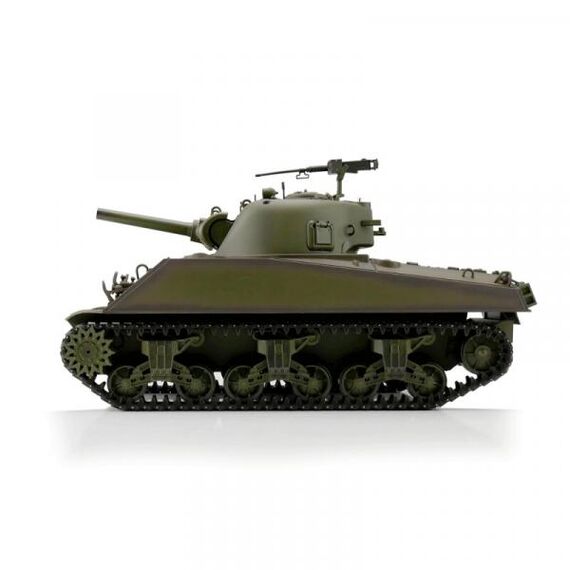Das kraftvolle Paket verfügt über eine 2.4 GHz Steuerung. Die Motoren mit optimiertem Drehmoment verleihen dem M4 Sherman eine präzise, ruckelfreie Fahrt. Nylongetriebe mit robusten Zahnrädern und einer verbesserten Übersetzung sorgen für höhere Kraft. Durch die proportionale Steuerung können Sie den Panzer ganz langsam anfahren und die Geschwindigkeit stufenlos erhöhen. Der M4 Sherman fährt vorwärts und rückwärts, auch jeweils mit einer Links- und Rechtsdrehung. Ebenso lässt er sich auf der Stelle links- bzw. rechtsherum drehen. Sie können die Kanone heben und senken und den Geschützturm um 320 Grad drehen (je 160 Grad pro Seite). Verschiedene Motorengeräusche und die Rauchbildung aus den Auspufftöpfen runden das realitätsnahe Erlebnis ab.