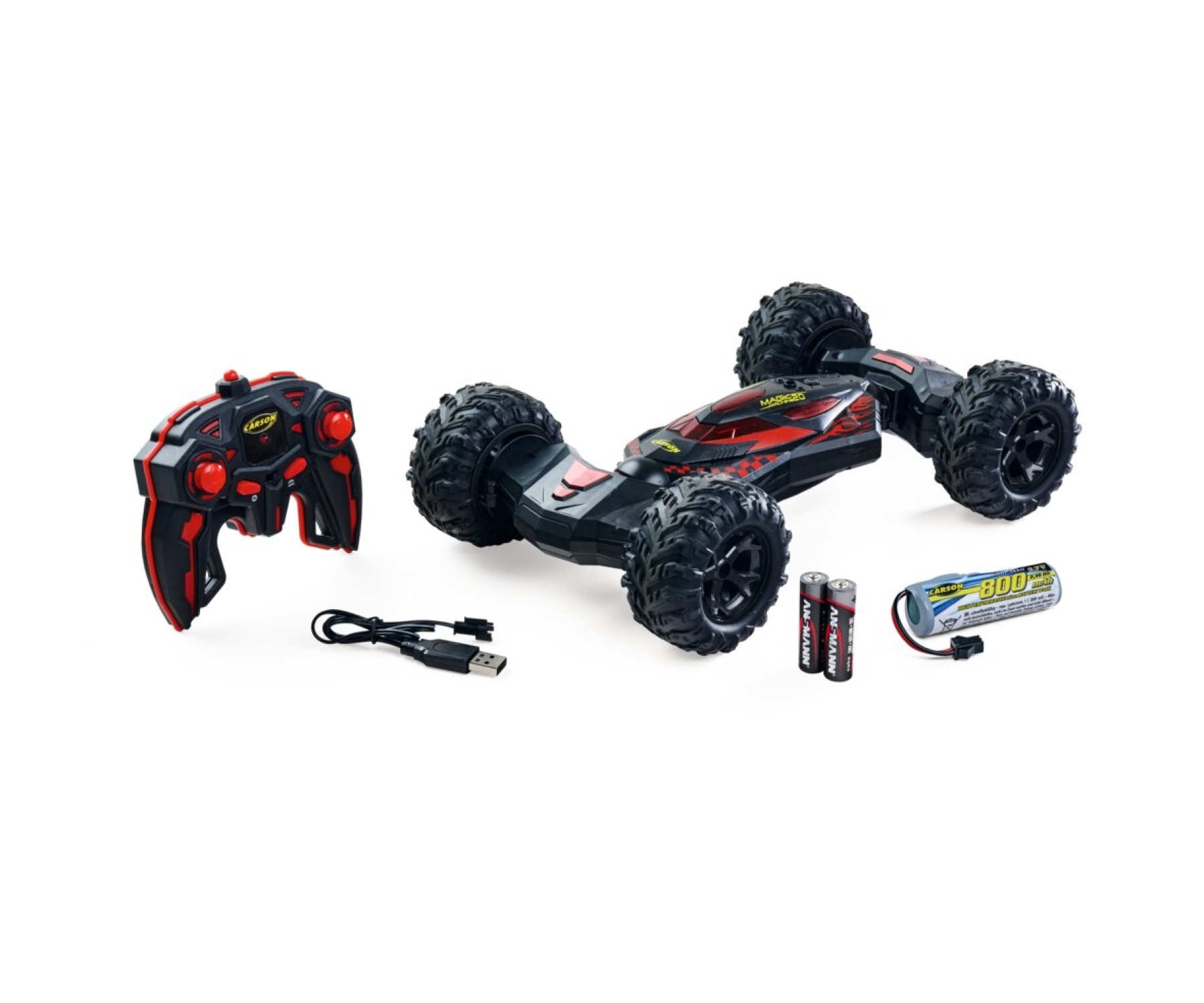 Magic Moment – Mit einem Knopfdruck wird Dein extrem flacher Racer ein vollwertig allradgetriebener Geländewagen, oder stellt sich bei Querlage sofort wieder auf und bringt sich in Position zum Weiterbashen. Mit der „Magic Machine 2.0“ von CARSON ist fast nichts unmöglich: Über den Asphalt jagen im Race-Modus, Hindernisse mit einem Backflip meistern, sich überschlagen und auf dem Rücken weiterfahren... Durch das unterschiedliche Design der Ober- & Unterseite des Fahrzeugs wird von einem Moment zum Nächsten im Handumdrehen ein anders aussehendes Fahrzeug! Die 2,4 GHz Fernsteuerung erstrahlt im Gamecontroller-Look. Wird das Gelände beim Fahren zu rau, ist das Fahrzeug per Knopfdruck am Sender in einen geländetauglichen Offroader mit beachtlicher Bodenfreiheit verwandelt und in Position gebracht. Die großen Gummireifen mit extrem griffigem Profil verleihen der Magic Machine genügend Grip auf jedem Untergrund. Eine spezielle Konstruktion lenkt die Vorder- und Rückeinheit deiner Machine separat, sodass der Renner an beiden Achsen gleichzeitig gelenkt wird. Abgerundet wird das Gesamtpaket durch den 100 % kompletten Lieferumfang, bestehend aus Fahrakku, Ladegerät, Senderbatterien und Anleitung. Viel Spaß mit deiner Magic Machine 2.0 von CARSON. Kaufen – Laden – Fahren!