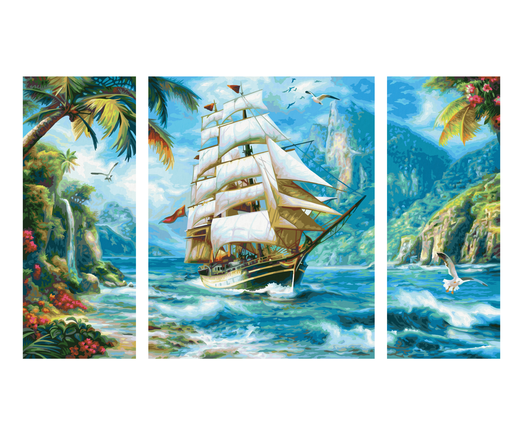 Türkisblaues Wasser, sanfte Wellen und ein stolzes Segelschiff, das ruhig seinen Kurs hält mit diesem hochwertigen Malen-nach-Zahlen-Set holst du dir Urlaubsfeeling und maritimes Flair direkt nach Hause. Das dreiteilige Bild zeigt eine tropische Küstenlandschaft mit Palmen, Felsen und einem imposanten Dreimaster, der durch die Lagune gleitet. Die Szene erinnert an einen stillen Moment in der Südsee und lädt dazu ein, beim Malen den Alltag hinter sich zu lassen.