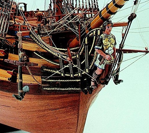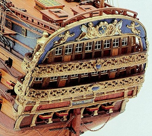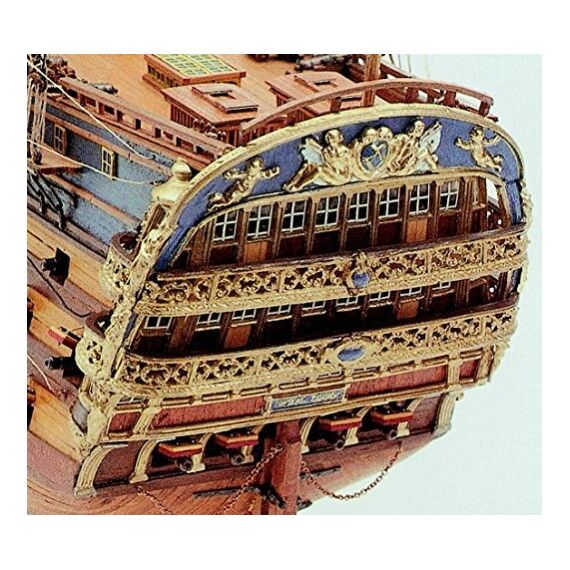 A Double planked hull construction using Lime and Walnut strips, pre cut frames and keel, deck planked in tanganyika, fittings made from brass, walnut, boxwood, and beech, wooden masts and spars, cast stern and quarter galleries, brass cannon barrels, rigging cord and silk flags. Full size plan sheets and a multi language instruction manual.