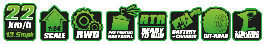 Dieser Offroad-Buggy im Maßstab 1:24 vereint professionelle Renntechnik in einem kompakten Chassis, mit dem man fast überall fahren kann – von improvisierten Indoor-Rennstrecken bis hin zu einfachen Hinterhofstrecken.