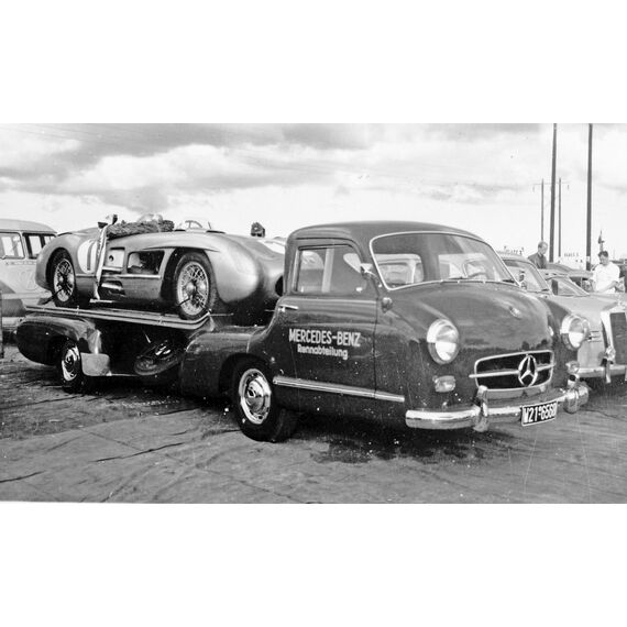 Der Mercedes Renntransporter "Das blaue Wunder" Bj. 1955-1967 mit 300 SLR Roadster LEGRAND 1:87 Kunststoff Modell-Set, sehr detaillierte Ausführung und Bedruckung, filigrane Felgen, Länge: 79mm Dieser spektakuläre Transporter entstand 1955 auf Wunsch des erfolgreichen Rennleiters Alfred Neubauer, auf dem verlängerten Chassis eines Mercedes-Benz 300 S und mit dem Motor des 300 SL. Er war viele Jahre der "schnellste LKW der Welt" und diente ausschliesslich des Transportes der Mercedes-Benz Rennwagen. Ab 1956 diente der Renntransporter als Ausstellungsfahrzeug und Blickfang in den USA und wurde später verschrottet. Ein perfekter Nachbau steht heute im Mercedes-Benz Museum in Stuttgart.