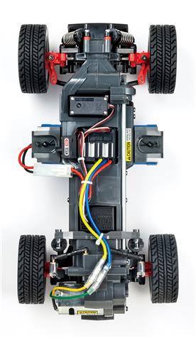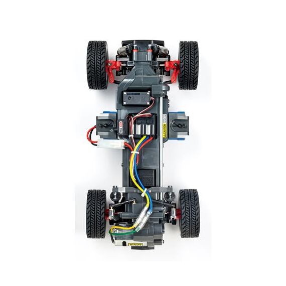 Das MF-01X 4WD Chassis in Monocoque-Bauweise hat den Motor im Heckbereich, die Kraftübertragung wird über Kardanwelle nach vorne geleitet.