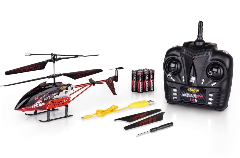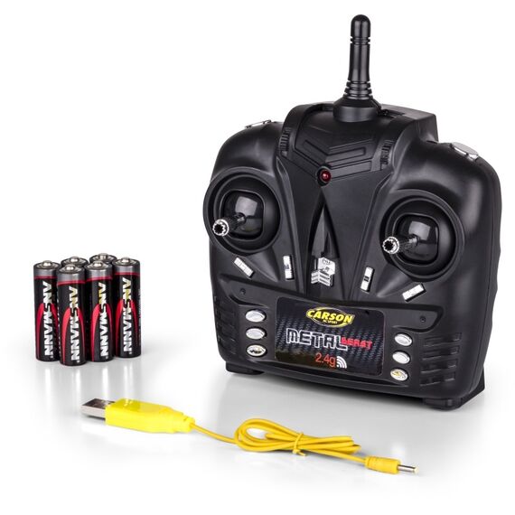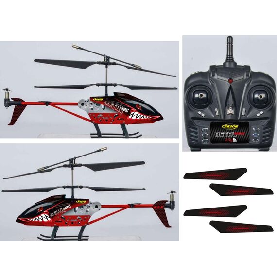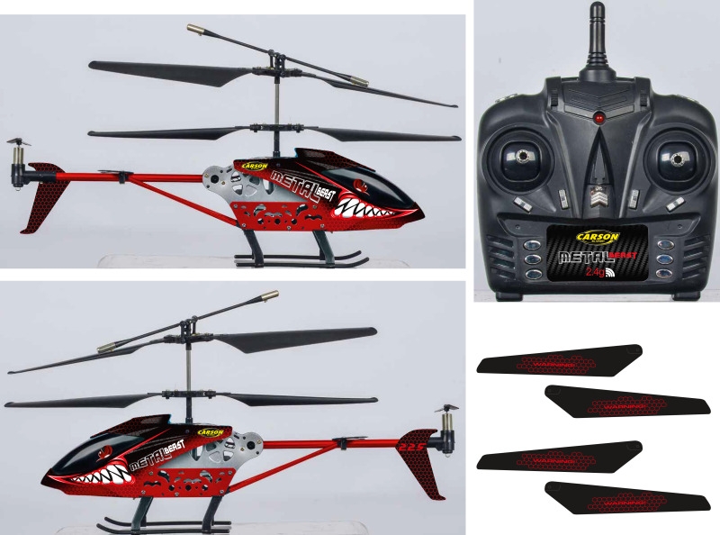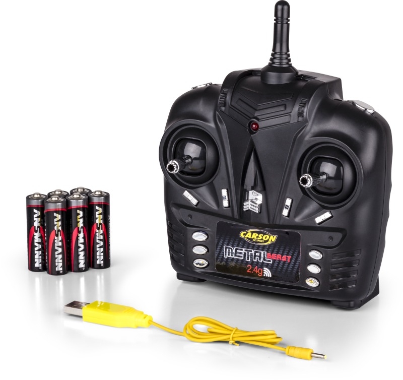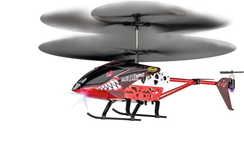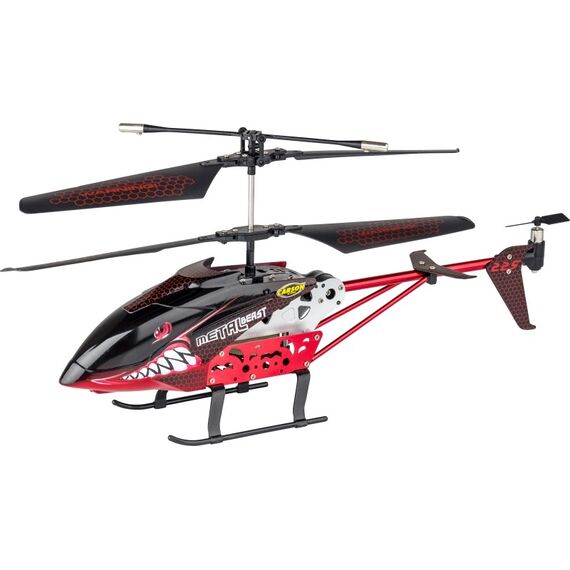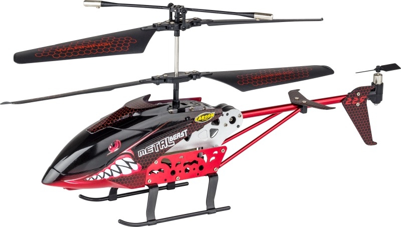 Das Metal Beast von CARSON ist ein leicht zu fliegender Einsteiger-„Fun-Heli" mit Sonderfunktionen. Das Modell ist mit einer über den Sender steuerbaren Boost-Funktion ausgestattet. Diese gibt dem Beast extra Power. Ebenfalls über den Sender schaltbare LED verleiht dem Helikopter ein coole Optik. Easy Handling – Dank elektronischem Kreisel (Gyro) lässt sich der Heli einfach und sicher steuern. Metall-Chassis und Heckausleger sorgen für die nötige Stabilität. Viel Spaß mit deinem CARSON Metal Beast!