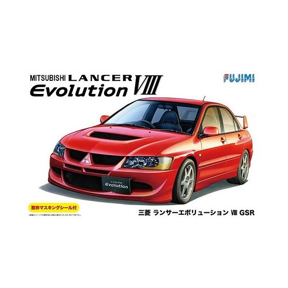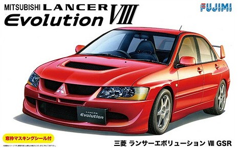 From Fujimi, this is a highly detailed model kit of the Mitsubishi Lancer Evolution VIII GSR in 1/24 scale. Parts come molded in red. Includes decals, clear parts, and window masking seals.